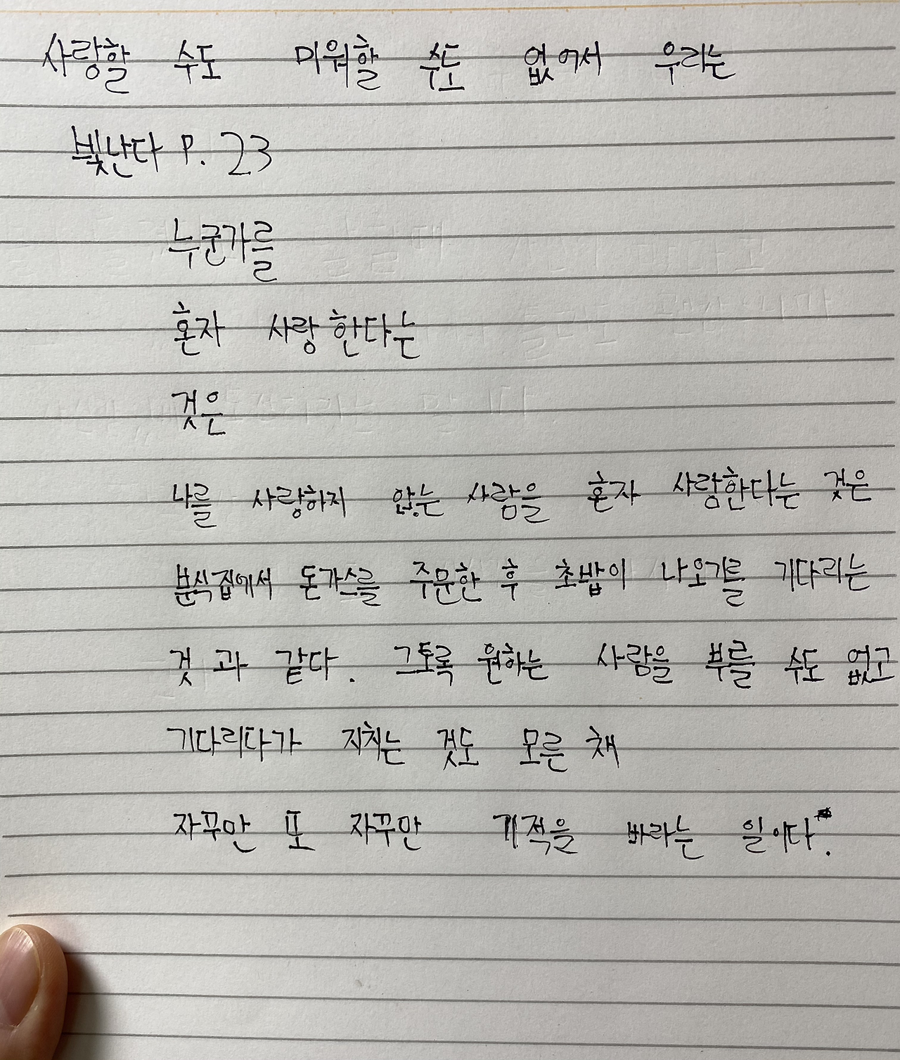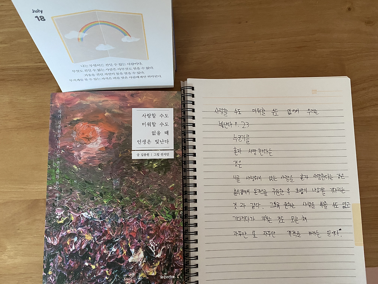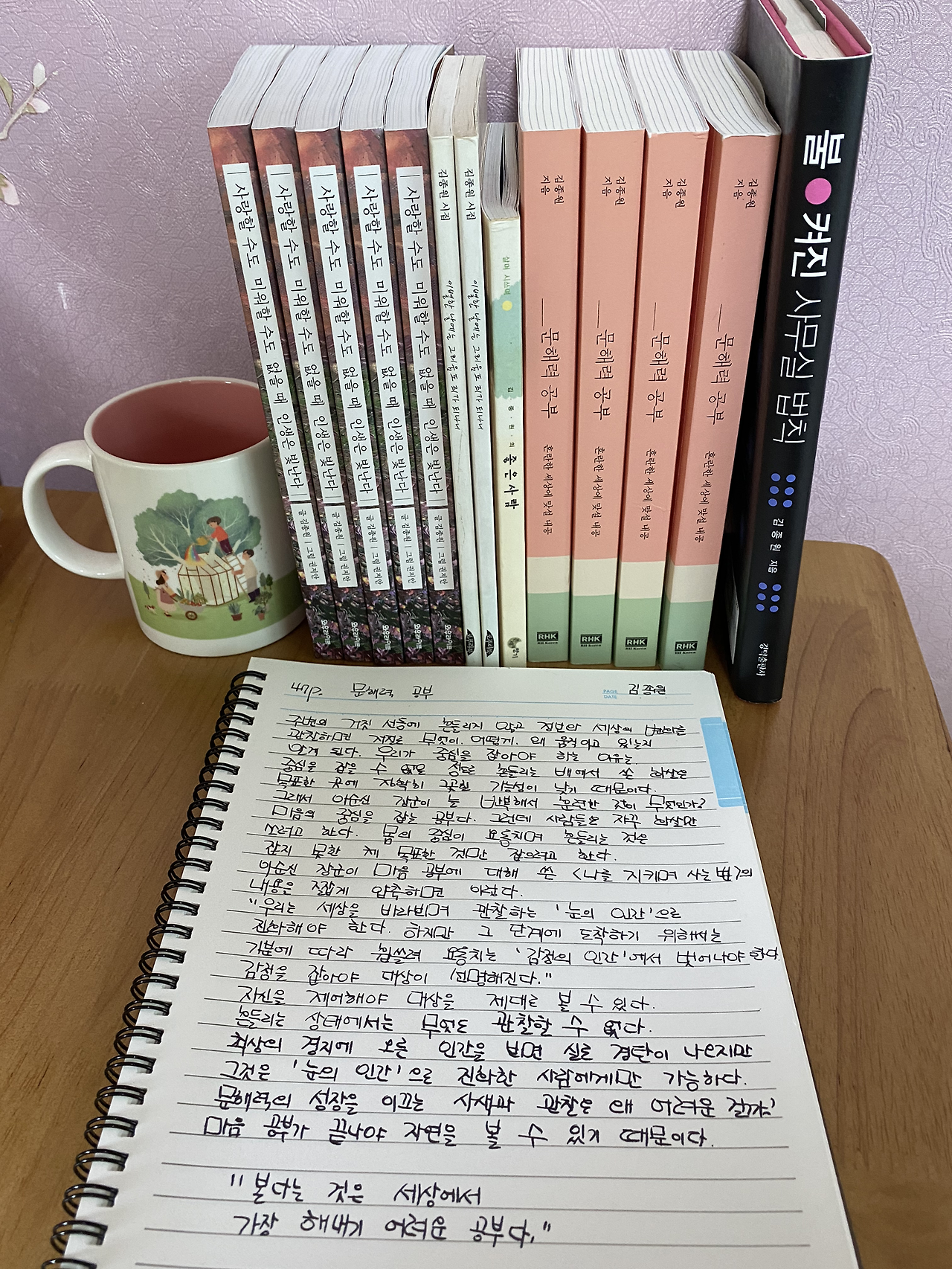 다가가서 보면 다가간다고 하고 멀리서 보면 멀리 있음을 말하는 아이의 시집살이를 하듯 울퉁 불퉁한 인생의 고개를 매일 넘을 때 내가 멈출 수 있는 시간이 바로 지성과 만나는 하루 10분 또 10분을 만나는 인문학 시간이다. 이 시간은 내가 도망치려거나 피해야 하는 것들이 아닌 내가 더 좋은 마음을 찾기 위해 노력할 수 있는 단 하나의 희망이라는 생각과 마음의 불빛을 찾아 나서는 일상의 인문학 시간이 되는 거다. 아이는 잘하고 있다. 많이 싸우고 견디고 그렇게 상처 내며 걸어온 우리의 세월이 존재하기에 반면 아이와 나는 스스로가 가야 하는 인생에 충실해야 하는 이유를 잘 이해할 수 있으니까.