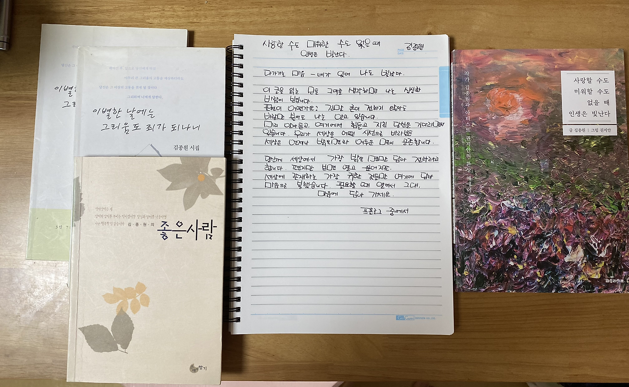 집에 돌아와 보니 딸아이의 양쪽 무릎과 손이 생각만큼 많이 멍들고 부었다. 타박상에 바르는 젤 타입의 로션을 발리 주고 나왔는데 아이 둘이서 예쁜 낭송 영상을 내게 보내왔다. 며칠 전 늘 나를 아껴주는 지인분께서 보내준 구하기 힘든 스타벅스의 렌턴 겸 블루투스를 켜고 둘이서 사이좋게 낭송을 한 걸 보니 내 마음이 환하게 켜 둔 불빛처럼 온화함이 느껴지는 오후를 맞이한다.