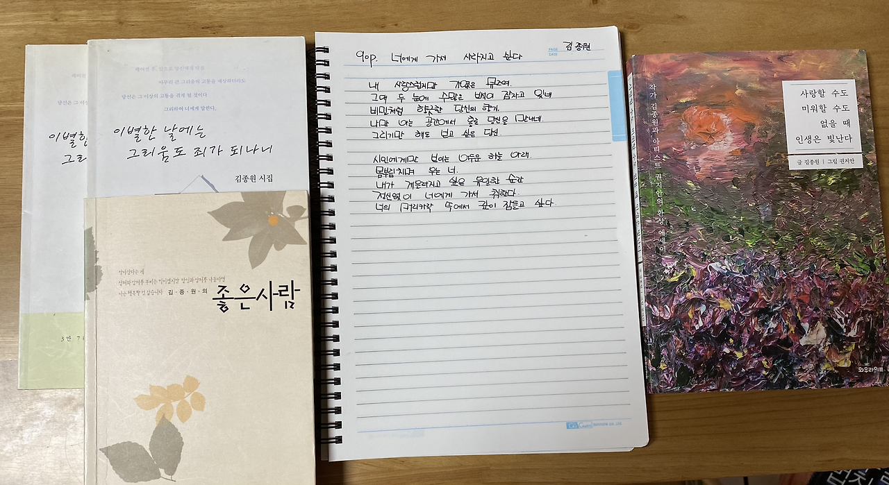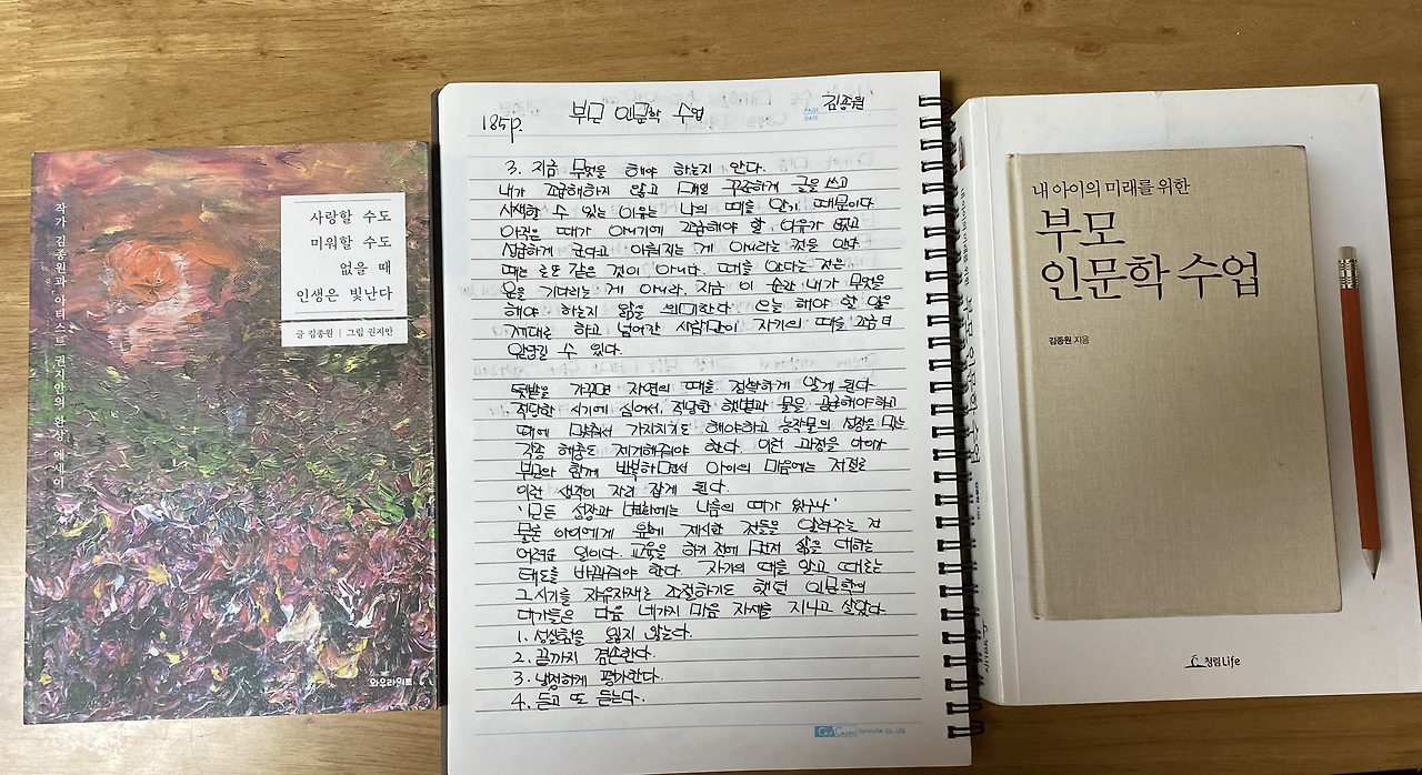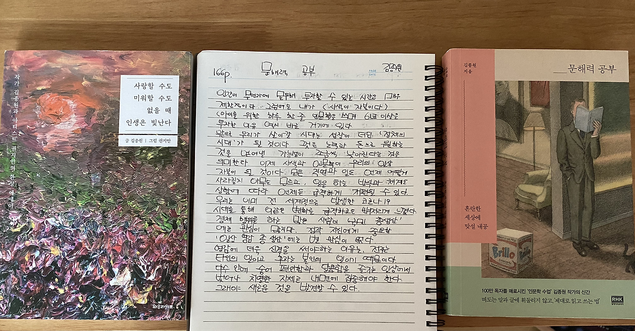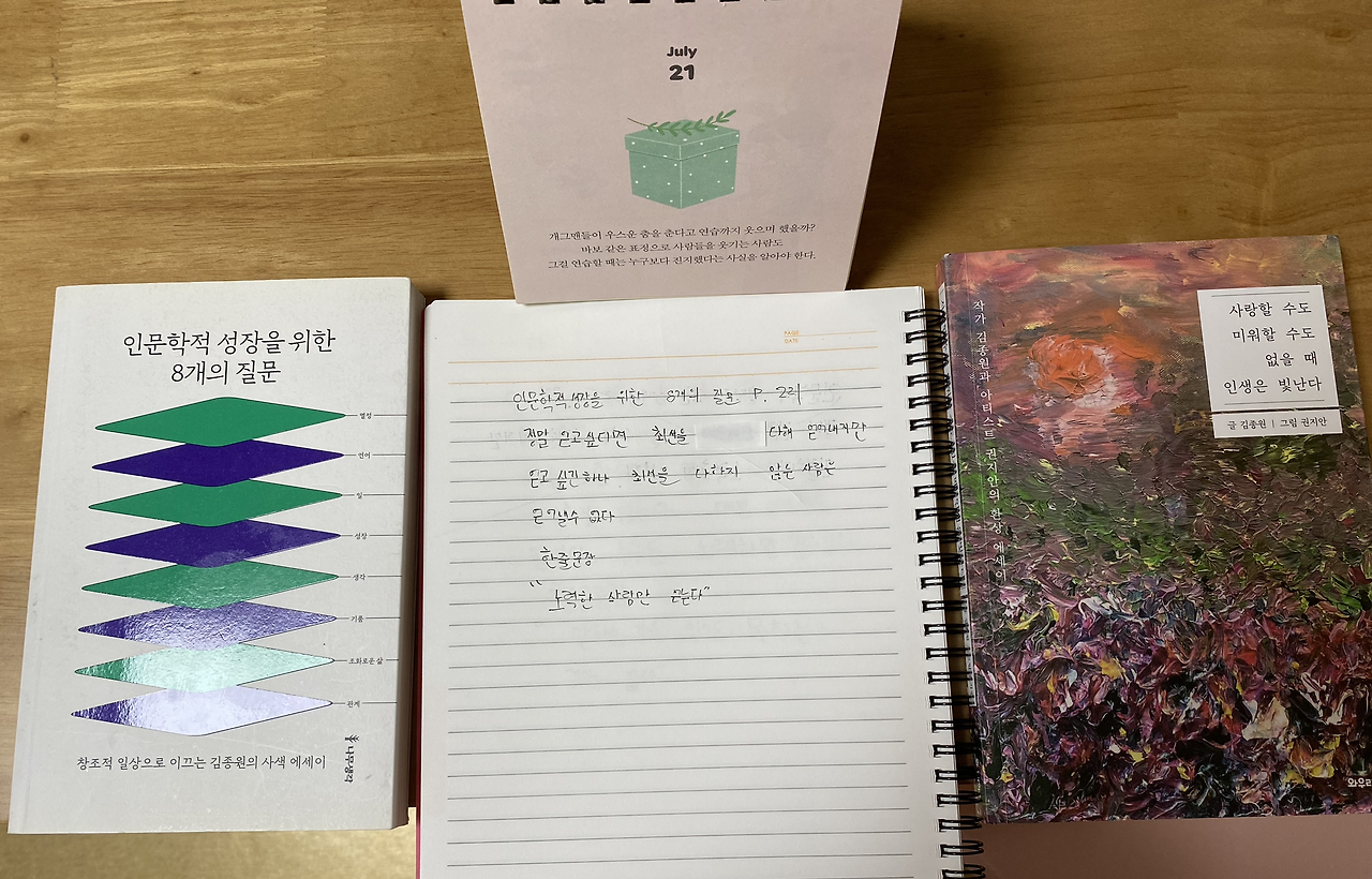 사람이라면 누구나 자기 삶의 영감을 찾으며 사는 일이 돈과 명예로 지킬 수 없는 인간이 가진 가장 큰 자본이 된다는 사실을 기억해야 한다. 지성 김종원 작가는 코로나 19 이전과 지금의 시대를 맞아 여전히 오랜 시간을 매일 일상에서 가질 수 있는 ‘문해력’을 전파하기 위해 책을 쓰고 글쓰는 사색의 삶을 멈추지 않는다. 가장 가까이서 매일 종원 작가님의 글을 읽고 쓰고 말하며 인생의 중반 너머에서 내 삶을 치유하고 보다 행복한 삶을 꾸려 나가는 내가 나의 증거이며 확신하는 삶을 살아가고 있으니까.
