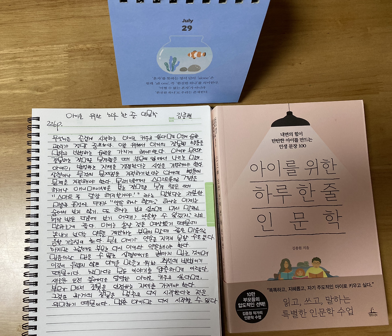 사람이 가진 가능성이란, 세상에서 만나는 것들의 똑같이 주어진 일상에서 내가 바라보는 다른 하나를 생각하며 살아가는 일이라고 말할 수 있는 것처럼 살면서 우리가 수 천 권의 책을 읽어도 크게 변화되는 게 없다는 것에서 생각하는 시선을 돌릴 수 있을 것이다. 반면 수천 권의 책을 읽는 것이 아닌 단 한 권의 책에서도 수만 가지의 가르침을 찾기 위한 시간이 ‘필사’와 ‘독서’ 그리고 ‘낭송’을 실천하며 독서의 시간을 아이와 부모의 일상에 두고 지적 엔진의 시동을 켜는 과정으로 사용할 수 있다는 사실이다.