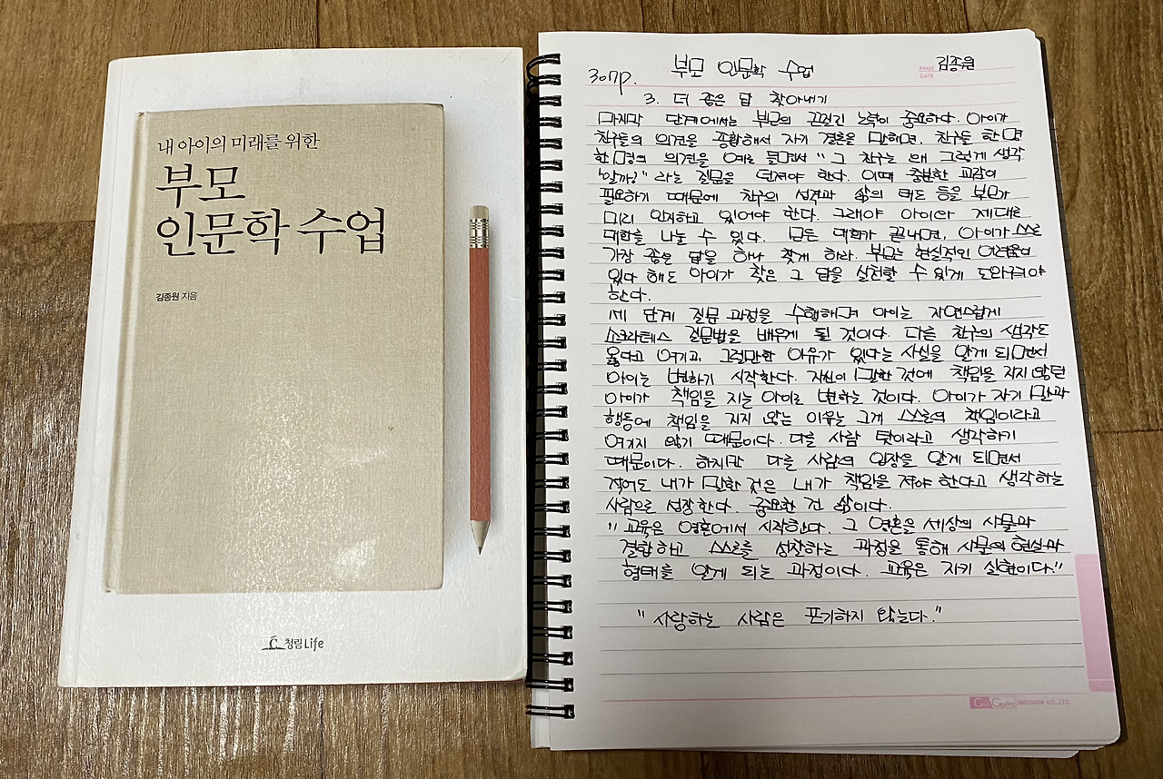 사랑하는 아이의 공부 의욕은 물론 삶의 태도까지 언어로 바꿀 수 있다는 게 김종원 작가님 께서 전하는 일상의 힘이다. 인간이 배울 수 있는 것들은 모두 언어로 되어있기에 가능한 일상의 모습이 될 것이다. 자신의 삶에 좋은 영향을 미치고 싶다면 언어를 찾아야 하고 배워야 한다. 언어로 된 갓은 우리 곁에 머무는 이 수많은 책들과 글이며 그중에 붙잡을 수 있는 하나를 나와 아이의 삶에 어떻게 적용할 수 있는가를 질문하고 실천에 옮기며 공부는 물론 살아갈 샮의 태도까지 바꾸는 일을 ‘하루 10분 인문학 수업’을 통해 인간은 성장하고 변화할 수 있을 것이다.
