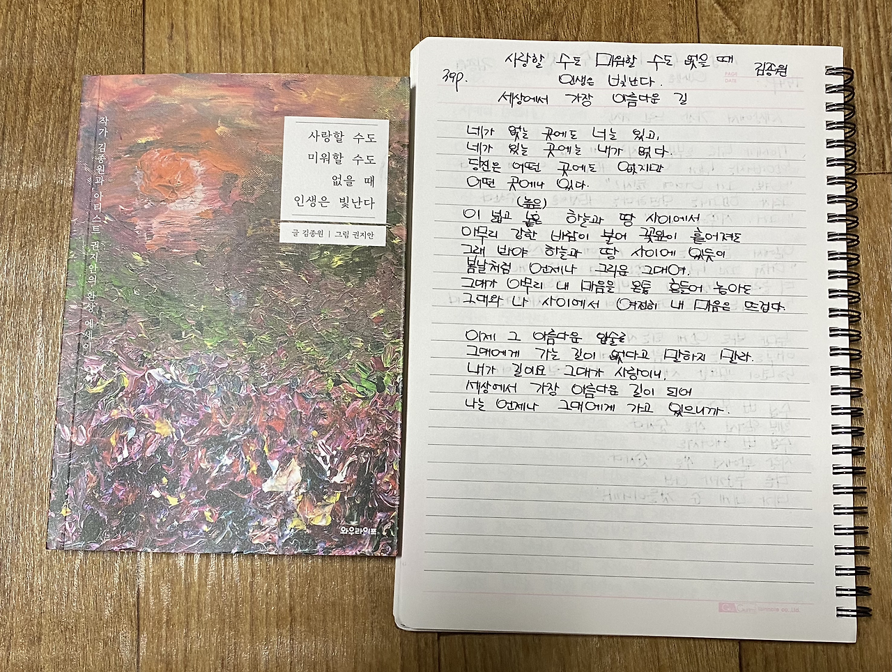 그렇게 밤을 지나고 내가 그 일을 선택했을 때부터 나는 주변의 말이나 느낌에서 벗어날 수 있었고 내가 하는 모습에 그저 하는 일을 실천했으니까. 나는 언제나 내가 선택한 일이 좋다. 친하다고 어려운 관계 속에 빠져 허우적거리듯 끌려가는 느낌은 만들고 싶지 않기 때문이다. 그토록 삶의 방향이 그리울 때 나는 대가 김종원 작가님의 책 한 권을 만나고 내 인생이 그렇게 다시 시작되었다는 사실이 일상의 꿈이며 선물이라는 것을 지금도 믿기지 않은 현실임을 매일 깨닫는다.