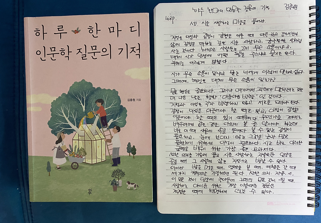 누구에게나 똑같이 주어지는 시간 속에서 다른 마음의 시선을 해석하는 것이 인간이 가진 생각의 힘이고 독서와 필사의 시간을 통해 인간은 그것을 발견하며 보다 나은 인생을 설계하며 살게 된다.