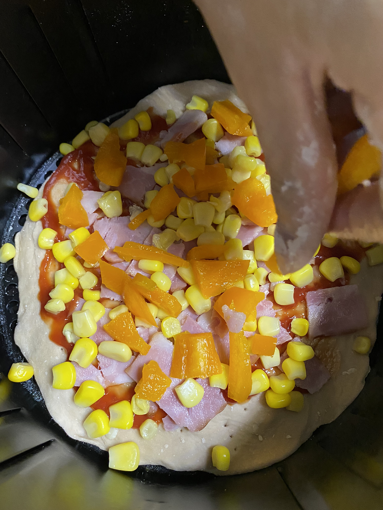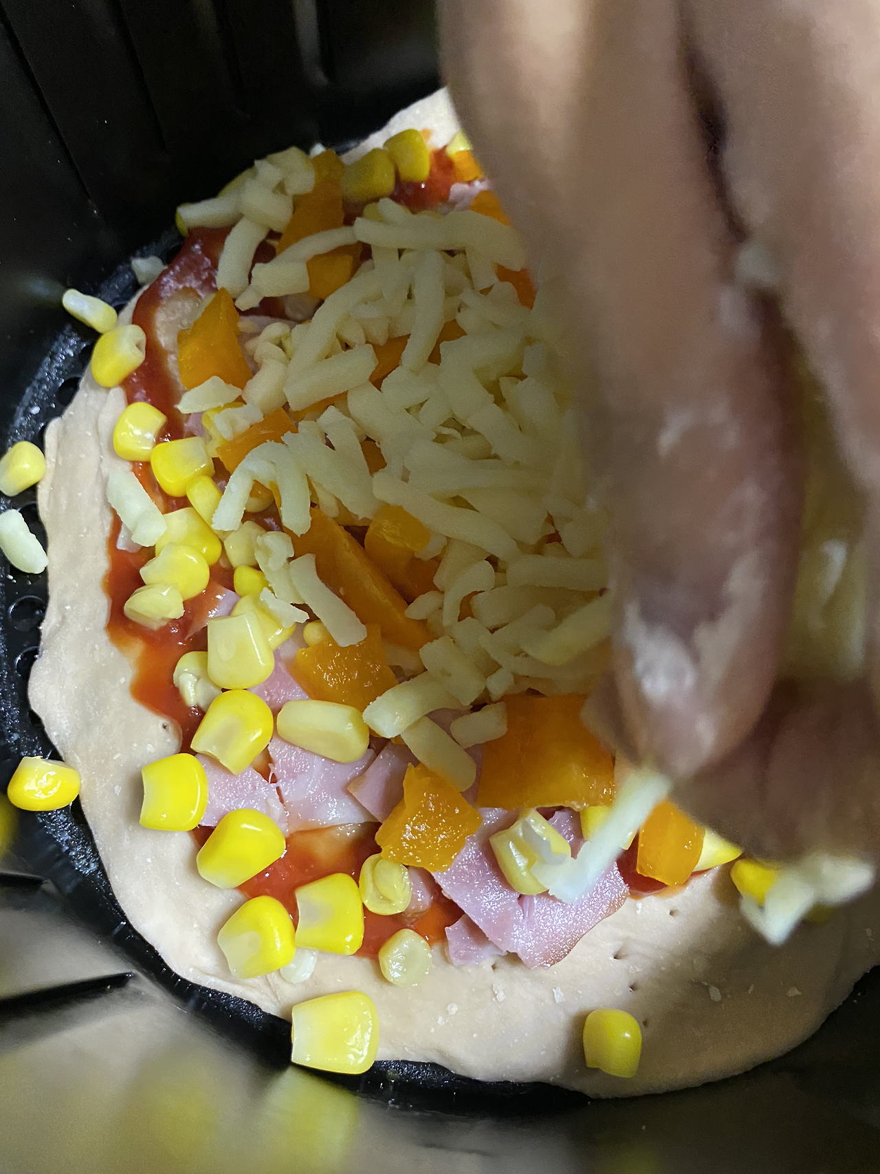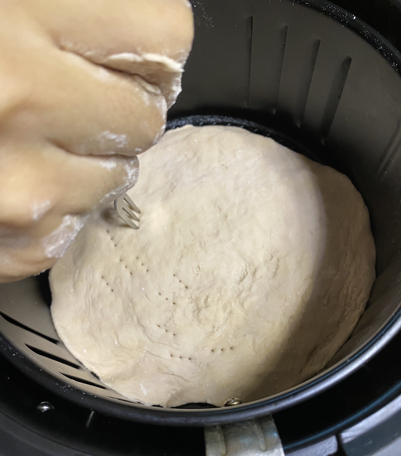 에어프라이어 에 기름종이를 깔아야 하지만 없는 관계로 밀대로 밀어 고르게 펴놓은 도우에 포크로 구멍을 만들어 줍니다.