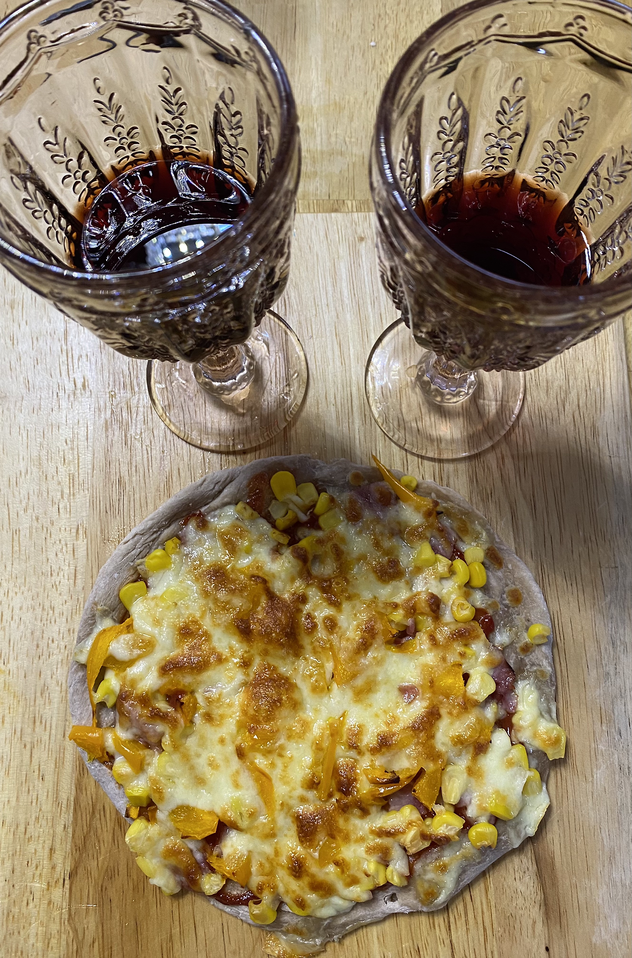 아이들이 조금씩 마신다며 와인을 이렇게 따르고 와인빛 피자를 함께 세팅하고 4분의 1로 가위질을 하니 세상에 없는 단 하나의 피자 선물이 완성되었습니다.