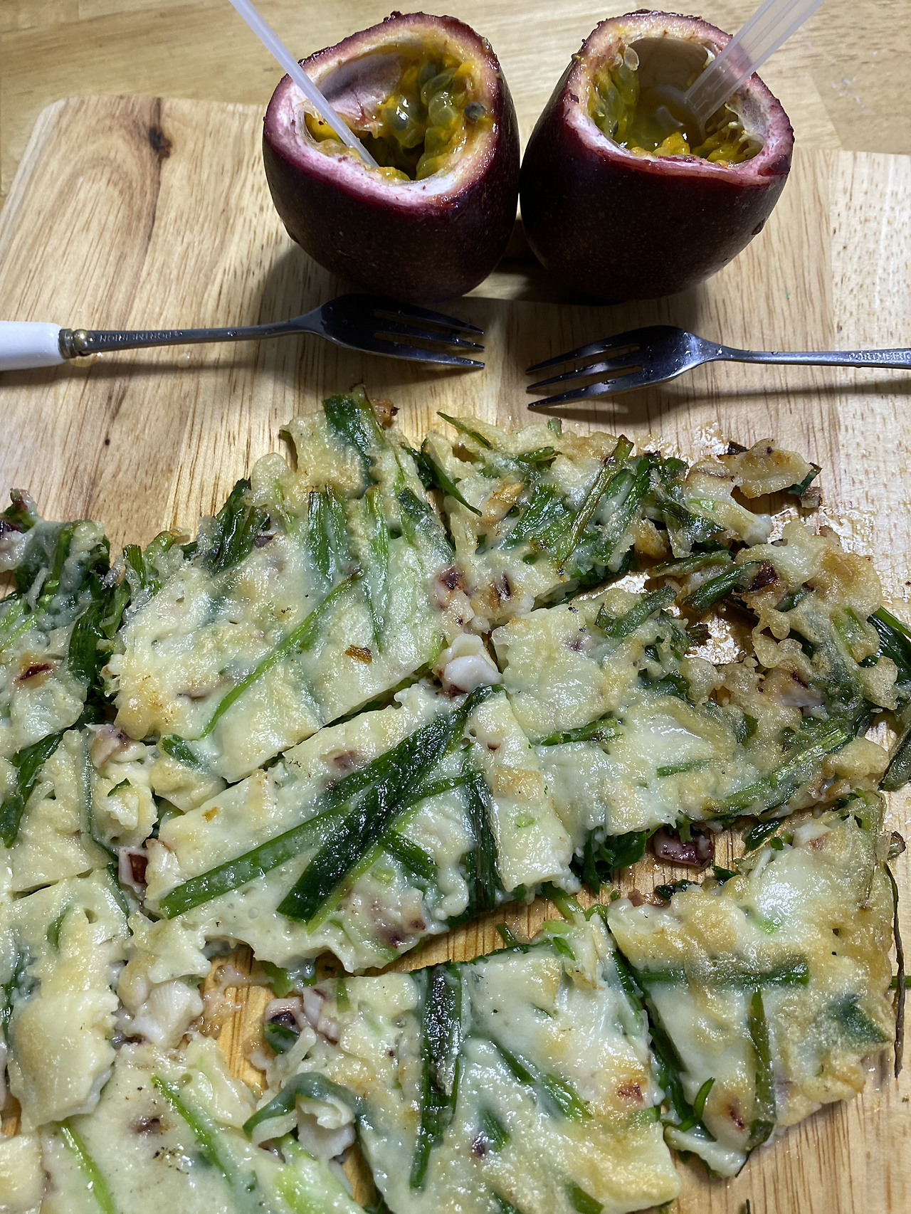 중학교 1학년 아이가 오늘은 부추 부침개를 요리할 생각을 했는지 마트에서 부추 한 팩을 손에 들고 나왔다. 냉동실에 있는 잘게 썰어진 오징어와 달걀 한 개에 부침가루 가 없어 지난번 피자를 만들고 남은 중력 밀가루를 이용했다. 이 요리의 이름은 부추가 잡초처럼 보인다고 해서 ‘잡초 전’으로 이름을 짓고 반죽은 장갑을 끼지 않고 만져보고 싶은 마음을 그대로 진행했다. 팩에서 꺼낸 부추를 보니 사이사이에 꽃대가 보여 손질을 하고 회사 근처 로컬푸드에서 이맘때쯤 막바지에 생산되는 백향과일 8개를