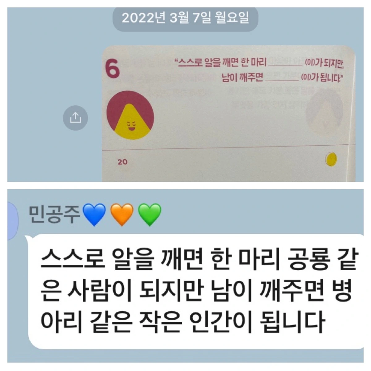 이 질문을 만든 작가님의 생각이나 깊이가 이 글을 읽고 생각하는 아이의 생각도 참 신선하게 다가온다. 큰 아이의 생각 또한 다른 주관이나 철학의 맛이 나지 않은가. 이제 대학생이 된 큰 딸의 과 여학생 수가 5명이라고 했고 한 명은 아직 본 적이 없고 기숙사에서 3명이 지내는데 이미 2명은 친구가 되어 계속해서 함께 통하다 보니 여고를 졸업한 데다 생각과는 조금 다른 어떤 느낌인 것 같았는데 한 번은 아이를 보고 달려와 준 여고 동창생과 점심식사를 함께 했고 드디어 오늘은 과에서 다른 한 명과 친구가 된 것 같아 내 마음도 함께 반가워진다.