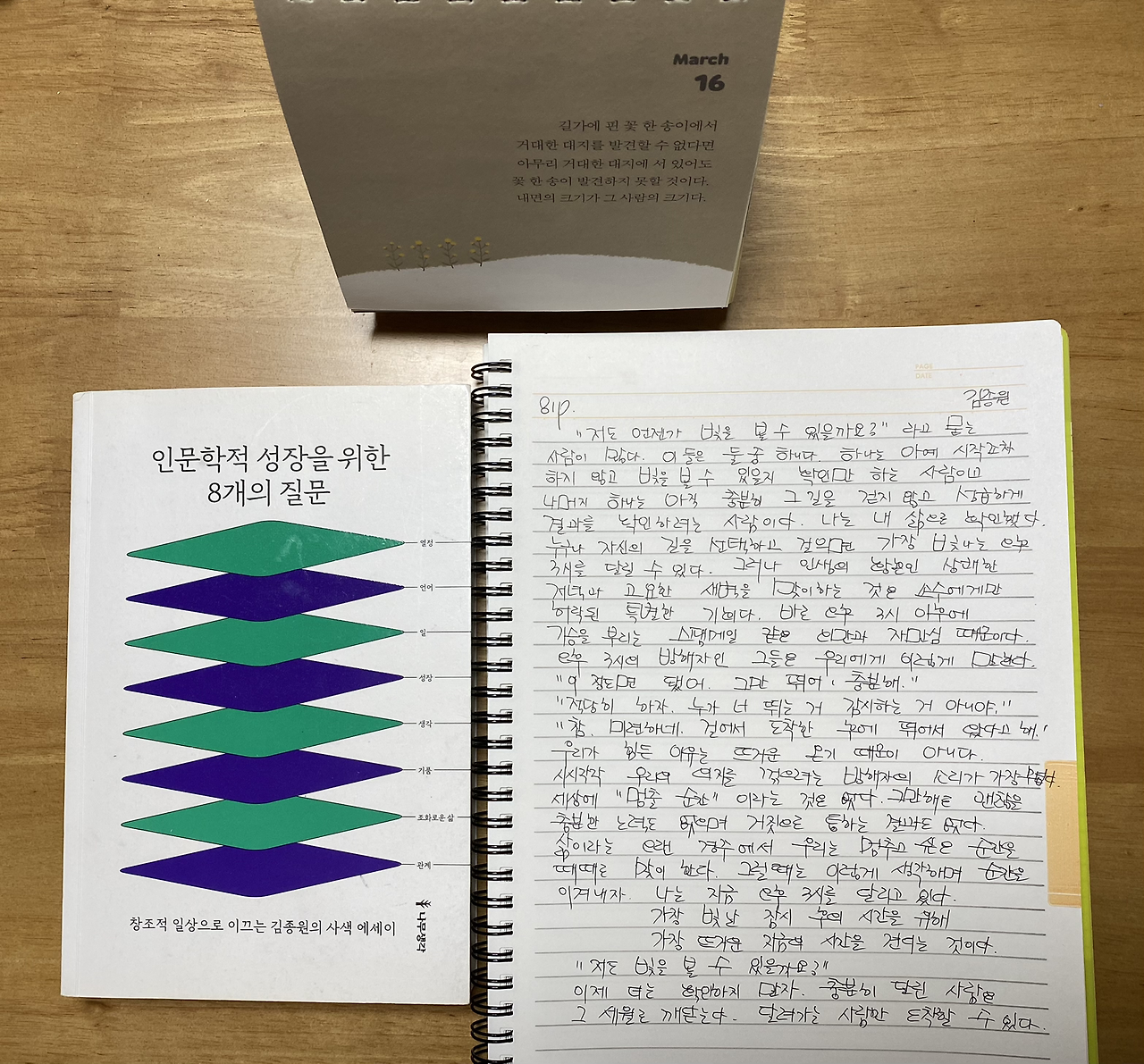 매일 아이들과 인문학 적 글과 책으로 사람이 살아가는 날 좋은 마음과 생각을 찾아가는 일이 좋은 작가님이 쓰신 살아있는 글과 책을 읽고 쓰고 낭송하며 자신이 살아가는 오늘 안에서 질문하고 해야할 일과 생각을 정리할 수 있음이 얼마나 근사한지 일상에서 아무리 흔들리는 바람앞에 서도 잠시 숨을 고르고 영원이라는 역에 도착하는 지성과 함께 하는 끝이 없이 계속되는 가슴 뛰는 인생의 길이니까.