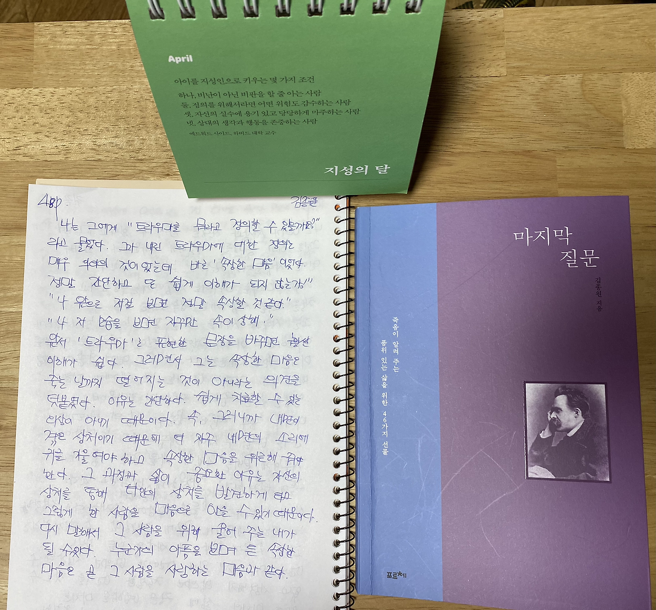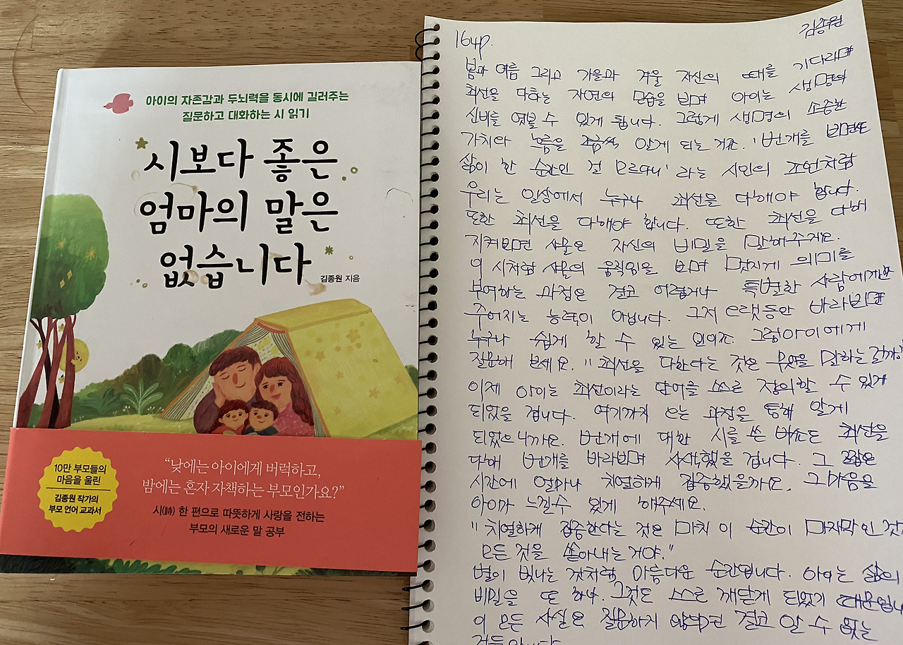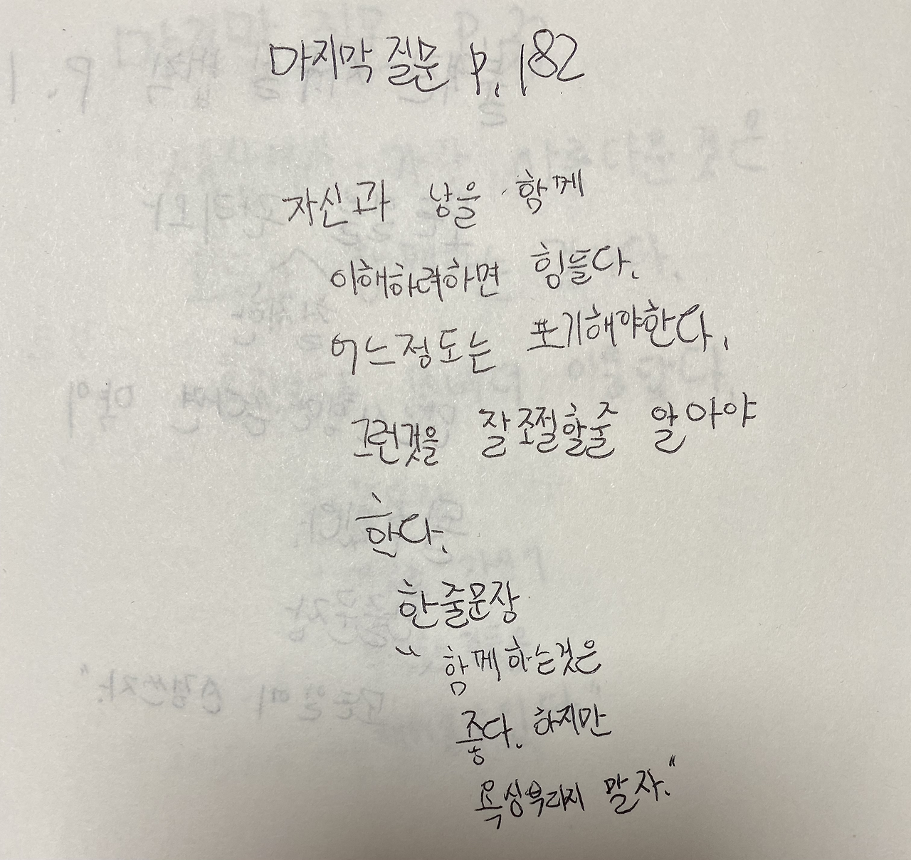 2. 마지막 질문 182p를 읽고 중학생 아이의 필사.
