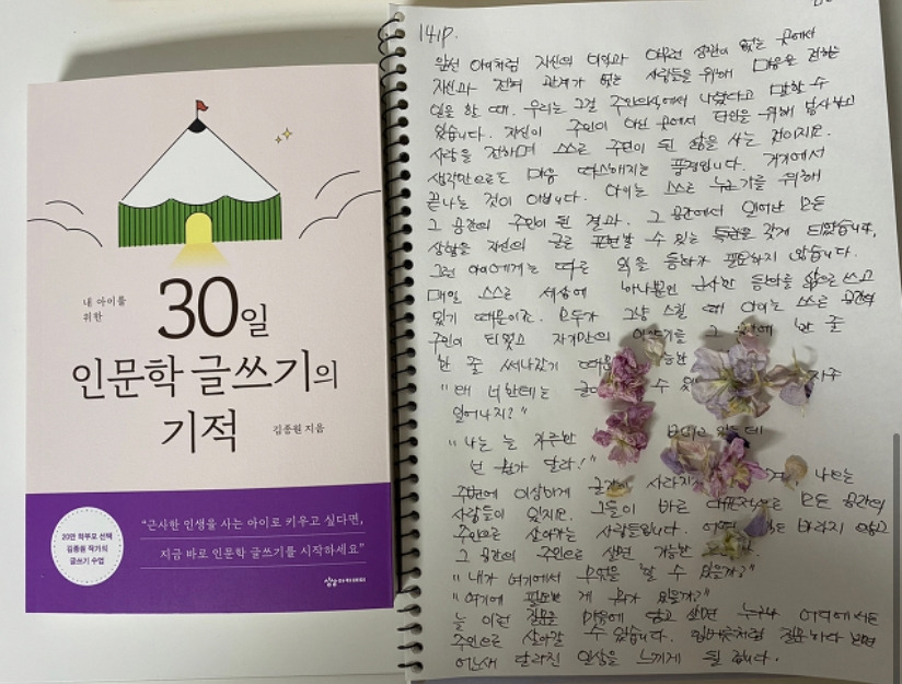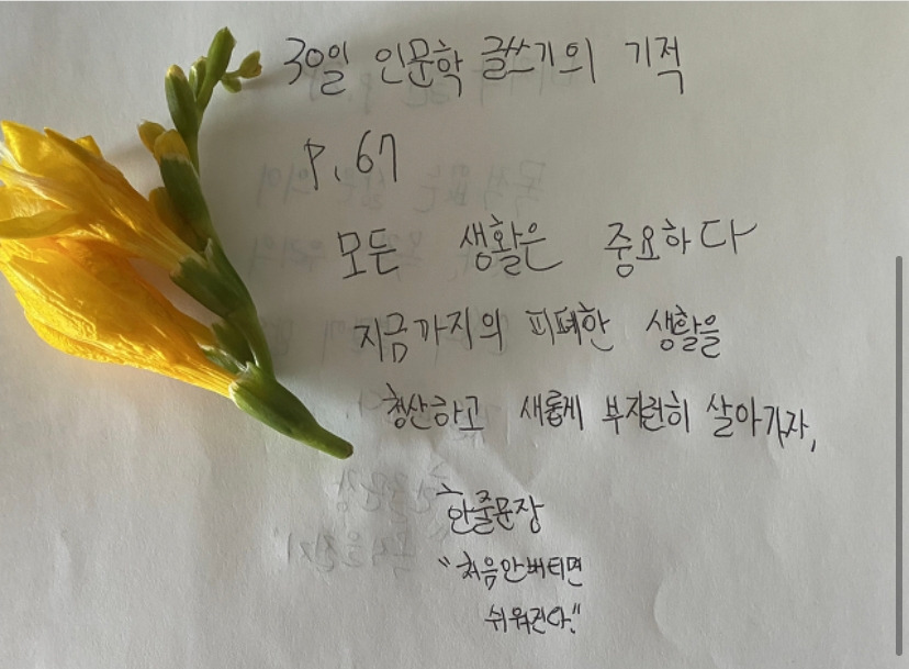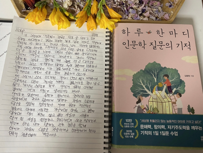 그저 아이나 나는 내가 집에서 하는 일 즉 좋은 책 단 한 분의 책을 계속해서 읽고 단 한 페이지를 보고 필사로 옮겨가 인문학 글을 낭송하는 일 외에 다른 비법을 알지는 못한다. 무엇을 하든 사랑하는 것에는 노력이 존재하지 않는다는 말이 우리는 질문해야 할 새로운 시도가 될 수 있다는 것을 기억해야 내게 그리고 아이들에게 도움이 되는 마음자세로 살아갈 수 있으니까.