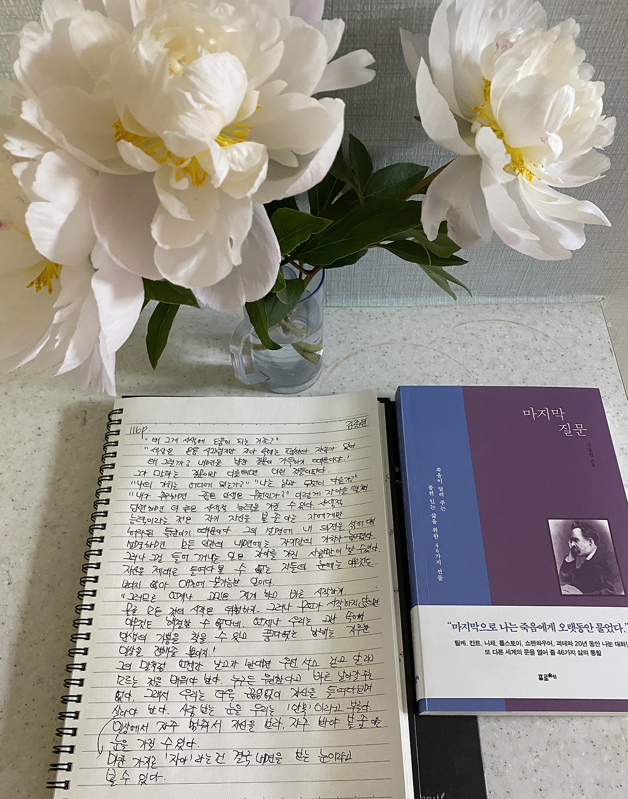 시집을 읽고 쓴 중2 아이의 글이 내가 아이에게서 느끼는 바로 그 느낌이라고 할 수 있다. 하루의 모든 바람을 느끼는 마음 무엇보다 평온한 시간이 언제나 지성의 공간에서 나와 함께 걷는 아이와의 생각 산책이 시작되는 바로 지금이다.