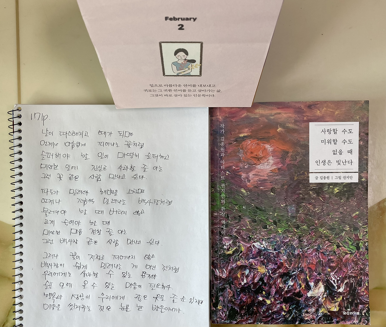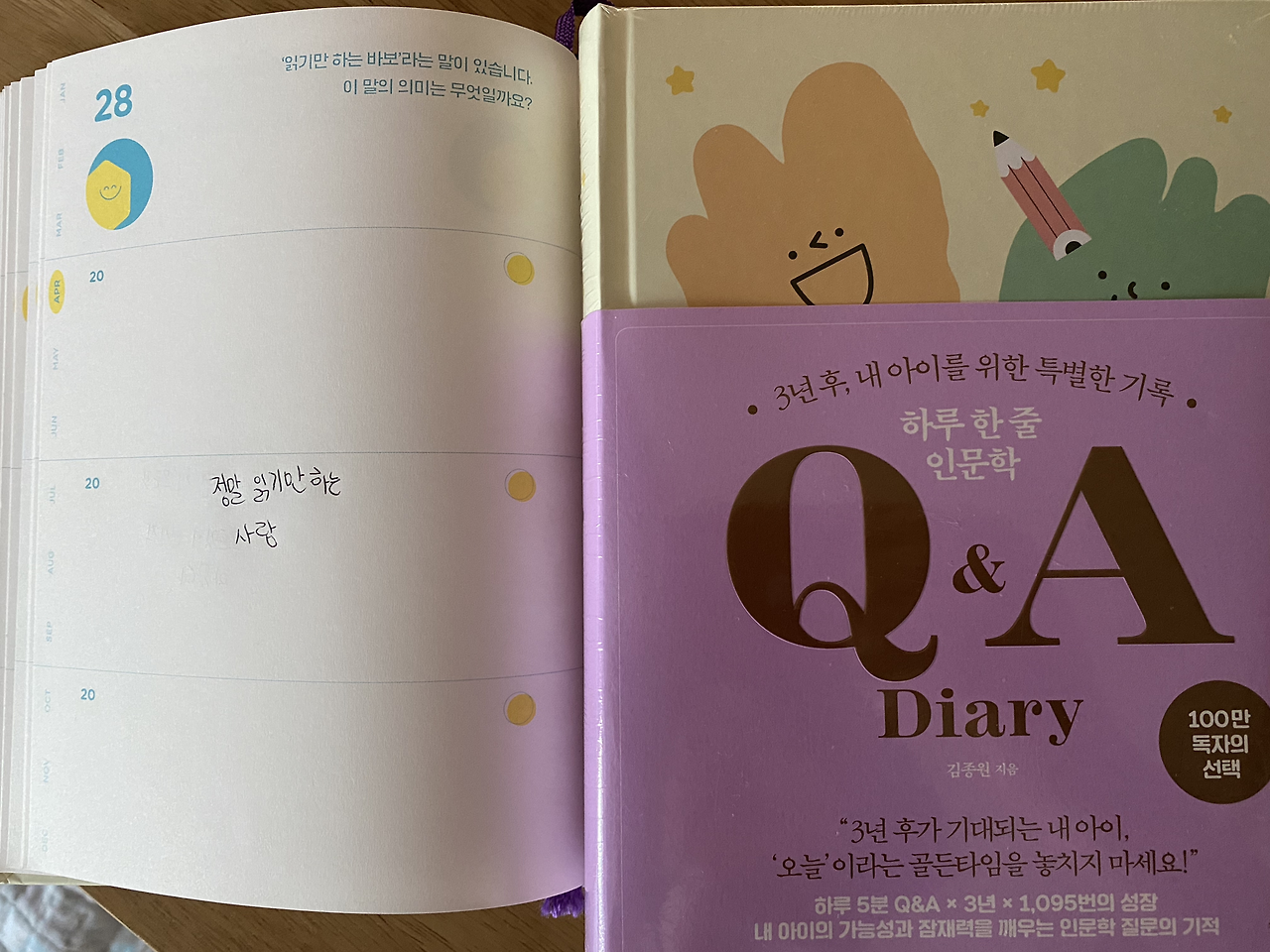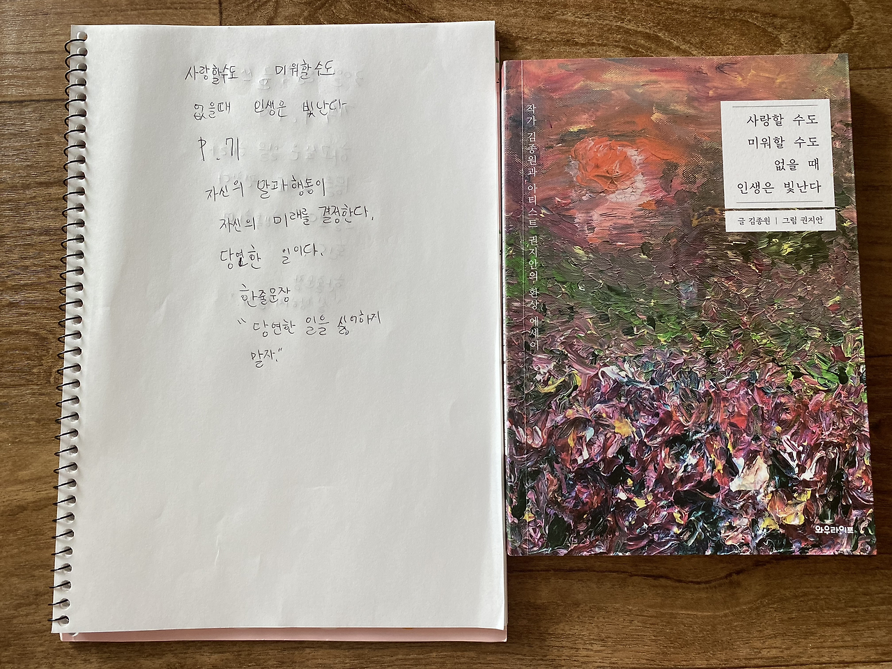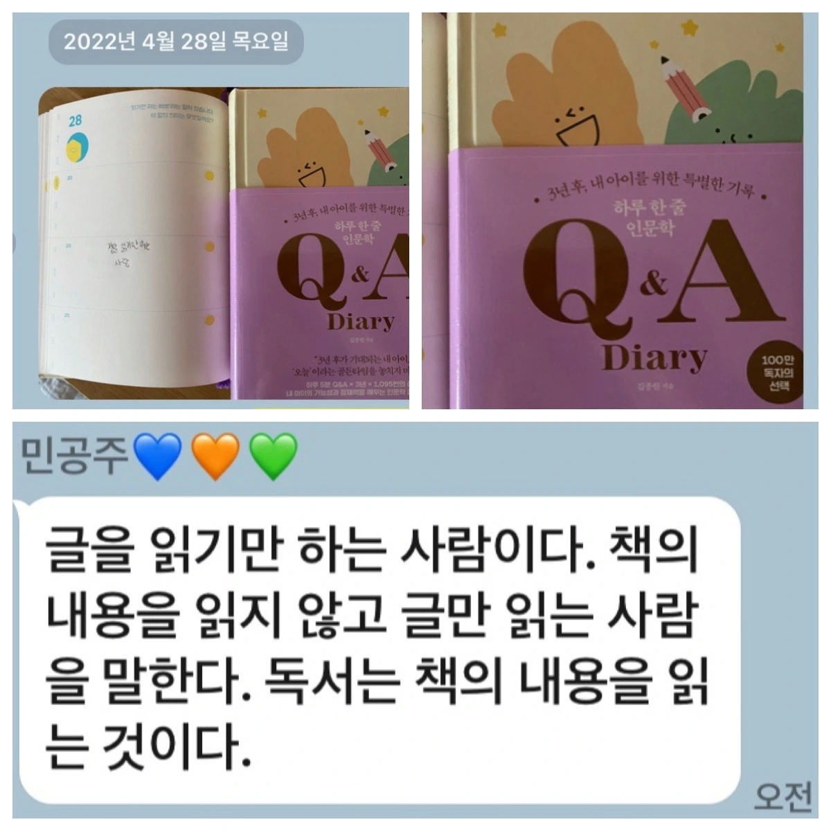 중학생 아이는 체육시간에도 늘 최선을 다해 즐기는 걸 좋아한다. 나는 매일 아침 아이가 밤새 해놓은 필사 노트를 펼쳐 사진에 담아두고 퇴근 후 차분하게 아이의 글을 이곳에서 마주하고 대학생 큰 아이는 자신의 용이한 시간에 인문학 다이어리 글을 쓰고 늦은 밤 모두 모일 때 두 아이는 모든 것을 멈추고 모여 인문학 일력 글을 선택하고 낭송을 한다.