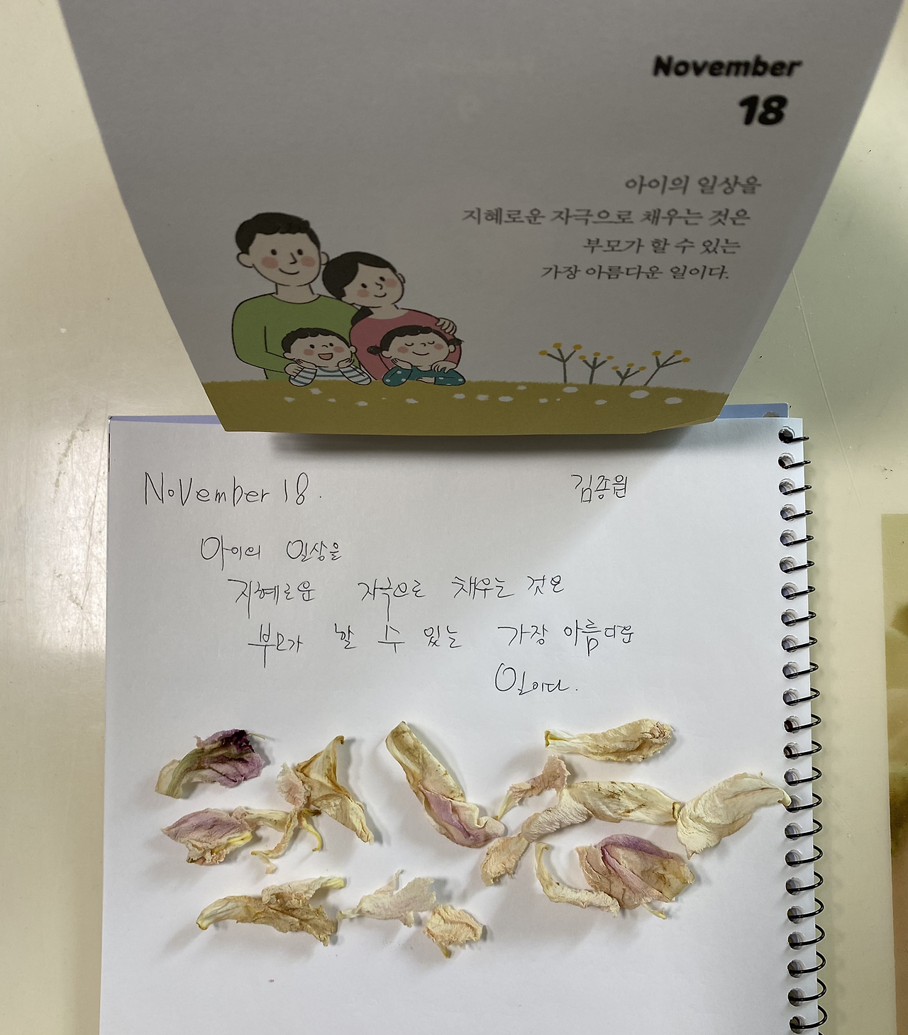 둘째는 오늘 학교에서 보는 수행평가 말고 중학생이 되고 첫 시험인 세 과목의 중간고사를 치르고 다른 날보다 일찍 집으로 귀가했다. 매일 자기의 시간에 충실한 아이는 받게될 성적만큼이나 아이가 공부라는 단어에 부담이나 불편함이 아닌 스스로가 해야 하는 당연한 일이라고 생각할 수 있는 게 아이가 부모에게 안겨주는 큰 선물이라고 나는 생각한다.