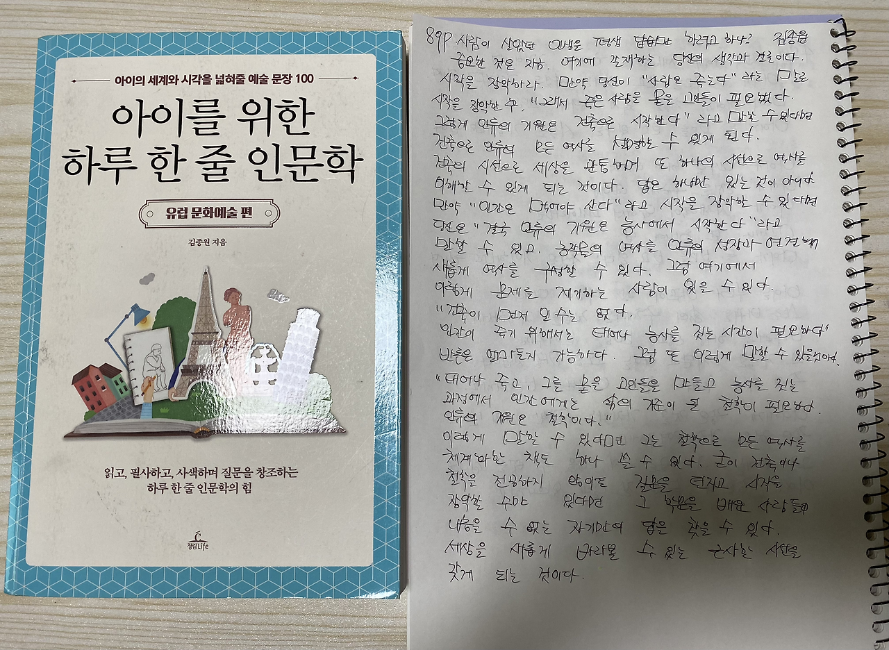 아이와 어른이 가는 길이 늘 하나다. 제아무리 뜨거운 청춘이 지나면 중년의 태양의 순간에 익어가고 삶에 순응하며 살아가듯 젊은이는 늙고 늙으면 누구나 죽음이라는 당연한 질문에 고개 숙일 때 나의 길을 꾸준하게 살아온 사람은 절대 자기의 삶이 부끄럽지 않을 수 있다.내 이이와 나에게 그러한 시간을 보다 일찍부터 쓸 수 있도록 결과가 아닌 오늘 시작의 종을 울리는 근사한 내면을 지닌 한 사람으로 살게 하는 게 궁극적인 교육이며 향하는 가치를 지닐 수 있도록 오늘의 시간과 머무는 지성 아래 펼치는 인문학 세상의 풍경을 그리며 살자.