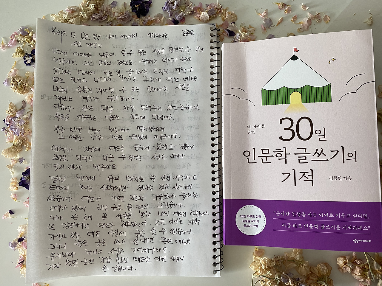 김종원 작가님 저서 ‘30일 인문학 글쓰기의 기적’ 도서와 하나로 연결된 워크북인 총 3권의 도서가 새롭게 출간되었다. 기적의 30 단어, 하루 하나 인문학 질문, 하루 10분 따라 쓰기 이렇게 3권으로 구성된 인문학 글쓰기 세트라서 태어난 저 하늘의 별들이 보물되어 우르르 쏟아지는 것처럼 반가운 느낌이 가득한 오후라서 여전히 귀하고 소중한 우리의 만남을 기대하고 싶다.