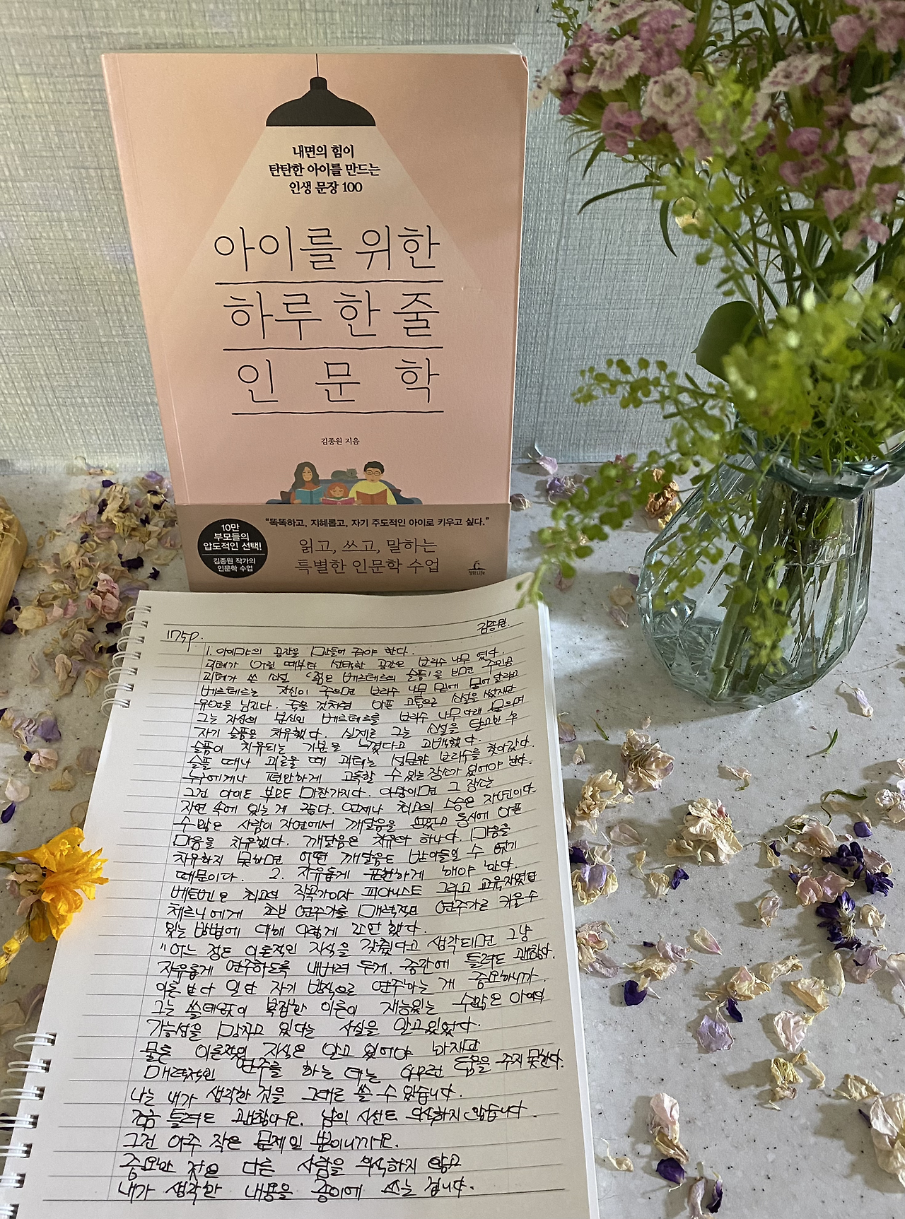 그래. 그것도 힘이 드는 일일 수 있다. 혼자서 조금 등을 구부리고 펴고 오르지 않고 젖히지 않은 오른 쪽 어깨의 팔은 두고 왼쪽을 이용하고 오른 손을 쓰며 무앗이건 서로를 지탱하며 도움을 받아 땀이날 정도로 어떻게 하기는 한다. 어찌 보면 혼자서 이게 무슨 일인지 참 우습거나 바보 같은 모습일 지라도 이런 내가 나라서 나는 하나도 이상하거나 부끄럽지 않다. 둘째가 쓴 필사 글에도 나온다 무엇이 의미이고 아닌지 가장 좋은 것을 생각하며 살 수 있는 시간과 감정의 소비를 잘 판단하고 사용하는 인문학 세상에서는 언제나 이렇게 반짝이며 살아 존재하니까.
