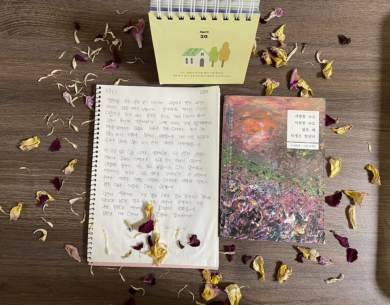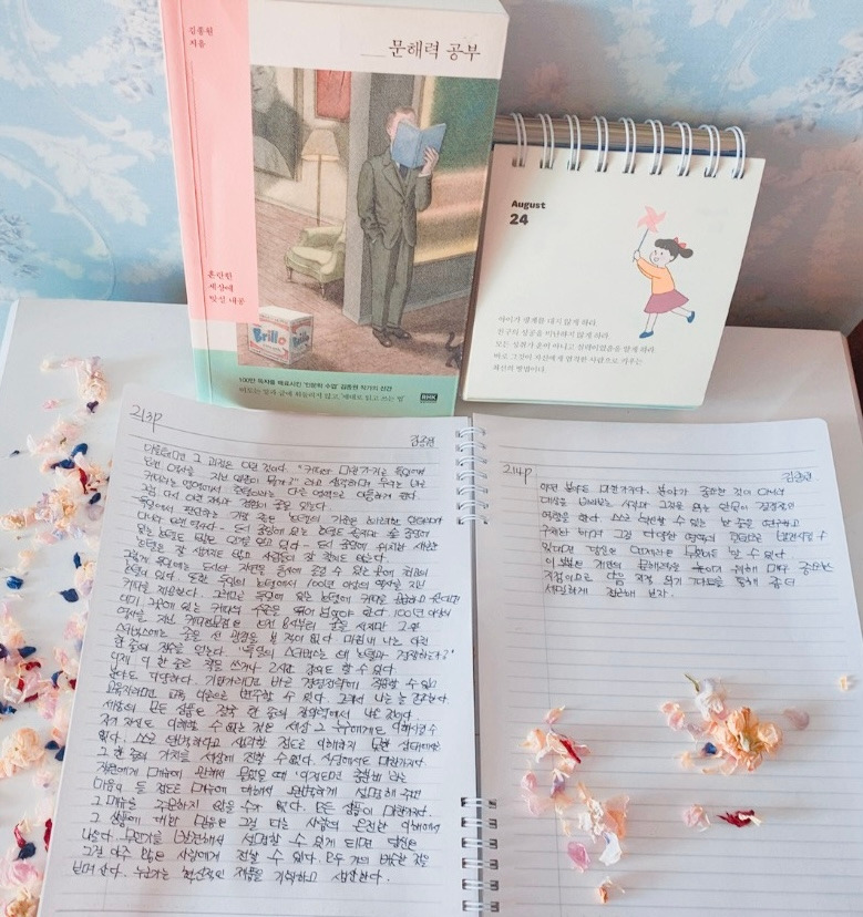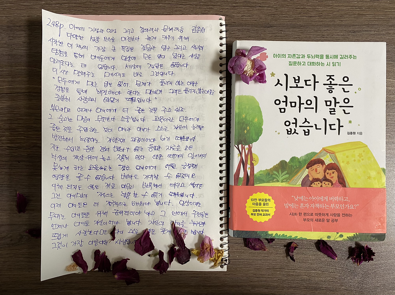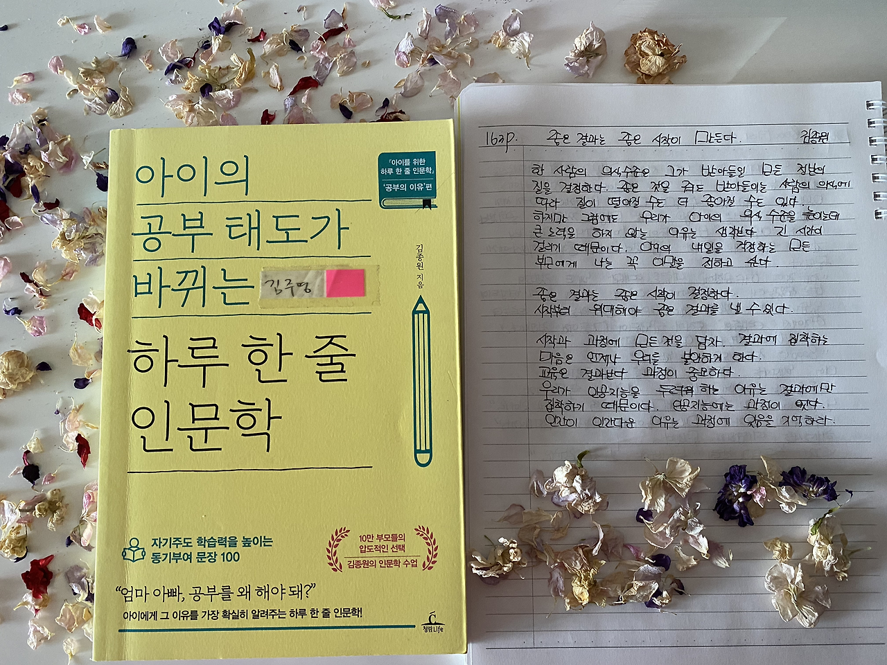 엄마도 둘 째도 필사와 낭송과 독서를 즐기며 자신을 대하는 자존감과 내면이 탄탄해지는 스스로의 모습에 깊이 빠지고 있다. 늘 잘하는 큰 아이도 어떠한 시간을 스스로 멈추어 필사와 글쓰기 낭독하는 일에 적극적인 마음과 태도로 다가오는 게 엄마로서 가장 큰 기쁨이자 우리가 쌓아가는 오늘의 영원을 부르는 기적과 변화의 순간이다.