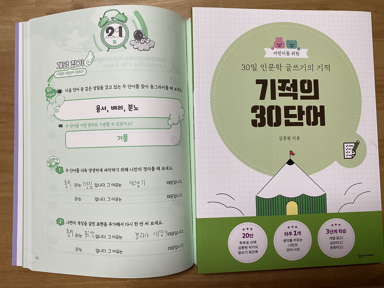 둘째는 글과 인문도서를 가까이하며 지금 하는 워크북 시리즈를 읽고 필사하는 일이 자연스럽다. 기적의 30 단어를 보며 혼자서 생각하기 쉽지 않은 단어나 문장의 범주에서 의미와 생각을 찾고 단어를 구분하는 힘을 기르기를 연습하고 하루 하나 인문학 질문을 보며 하루 10분 생각을 확장하는 질문 법을 통해 문해력을 높이는 아이만의 시간을 보낼 수 있게 되며 하루 10분 따라 쓰기를 펼치며 글을 쓰고 낭독하고 자신만의 문장 여행을 하듯 다양하게 펼쳐지는 글과 친해지는 법을 함께 할 수 있어 이 시간이 좋다고 한다.