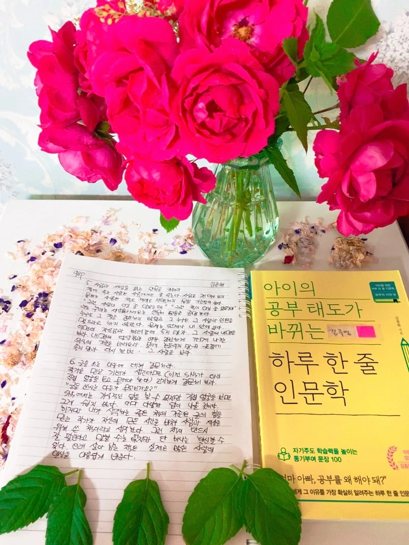 물론 예쁜 만큼 큰 가시와 작은 가시를 무척 조심해야 하기에 어쨌든 내 화병에 있던 꽃을 구분하고 장미꽃과 함께 마음을 꼽으며 베란다에서 잘 자라고 있는 페페민트 가지를 잘라 함께 꽃을 꽂으니 그 자체로 향기롭고 예쁘게 피어나는 화사한 꽃다발이 되고 늘 좋아하는 책과 노트와 참 잘 어울린다.