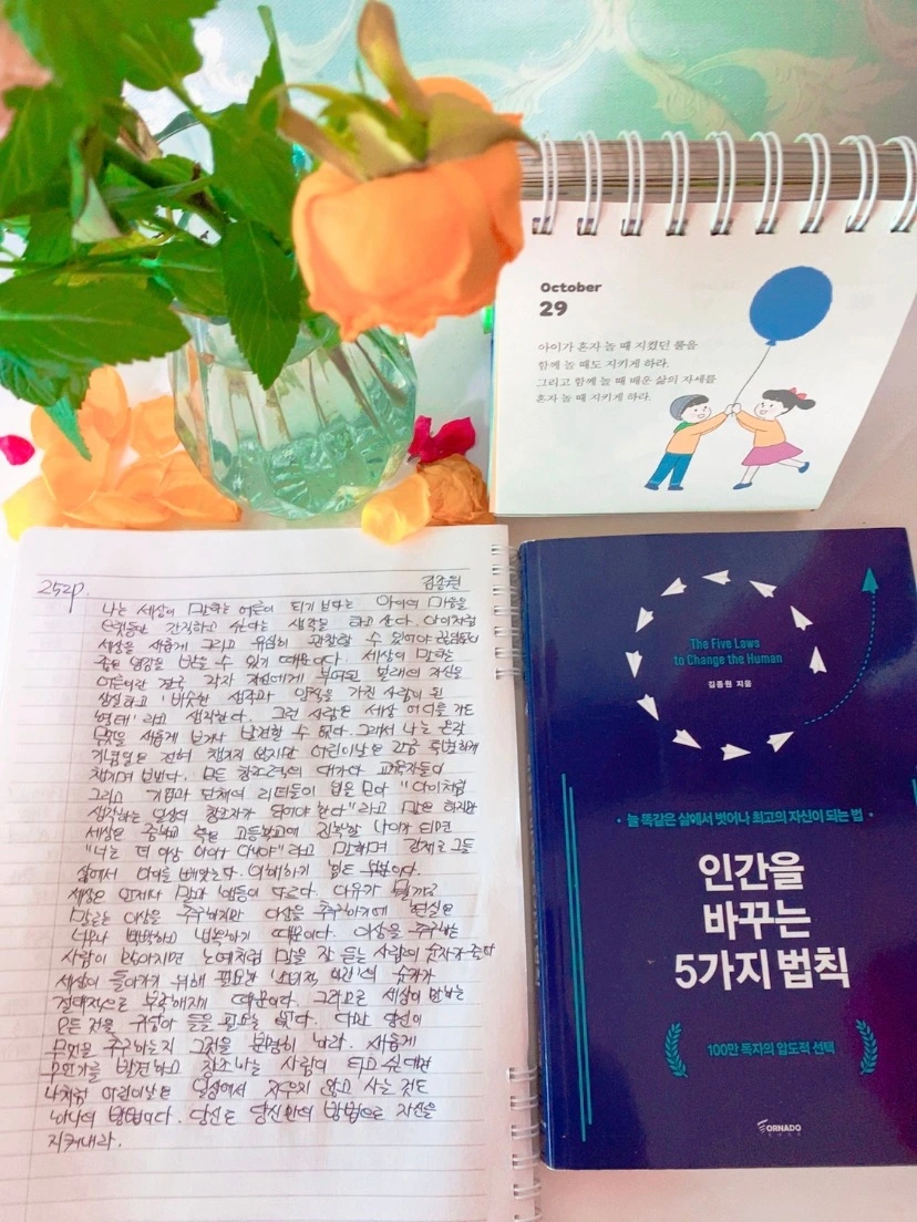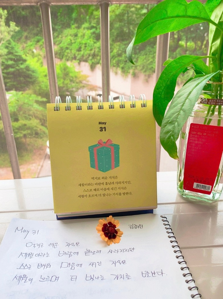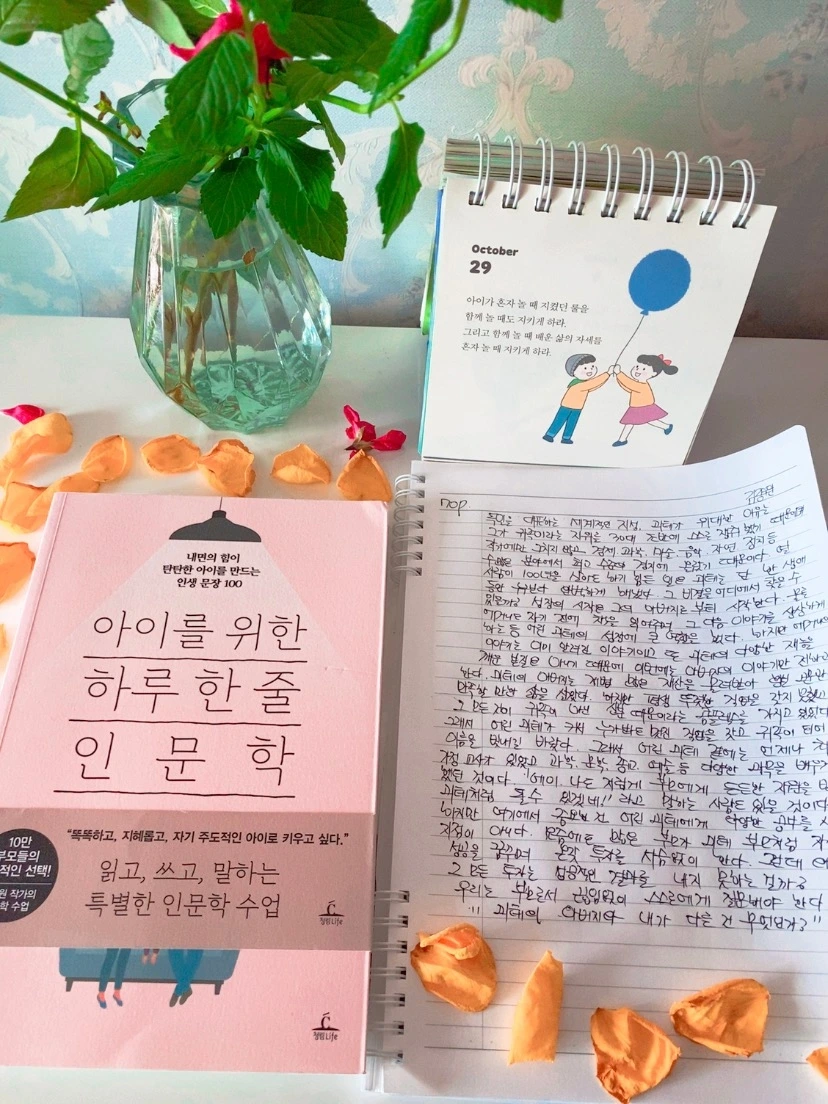그러나 더 묻지 않아야 한다. 지금 아이의 마음이 그러고 싶은 거니까 그것과 상관없이 아이는 다시 누나와 함께 인문학 달력 낭독을 하고 무거운 책가방을 다시 매고 일어서는 아이는 늘 성실과 꾸준함을 실천하는 그대로이며 역시 오늘도 아름답게 성장 중인 거다.