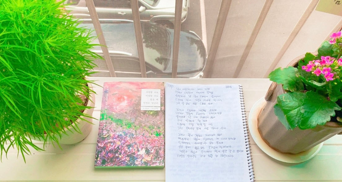 다시 작은 책상 주변에 아들이 쓰다 둔 볼펜을 들어 필기하고 어제 새로 꺼낸 노트에 맞춤처럼 이제 새 볼펜으로 바꾸는 일 이 중년 쉰이 지나는 길목에서 보는 나의 일상이 되었고 자고 일어났을 때 아이의 필사한 손길의 흔적을 바라보는 건 밤새 다가온 고마움의 꿈처럼 반가운 마음에 아침의 문이 근사하게 열리는 지성으로 향하는 믿음 하나가 언제나 참 좋다.