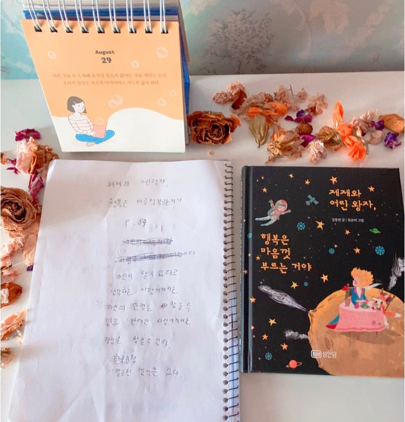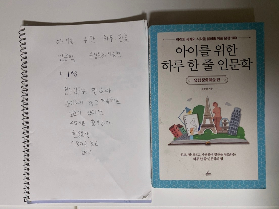 인문학 워크북 한 권이 빠져있었는지 다음 날 아침 찾으며 확인 하는데 항상 정확한 아이의 하나가 분명 보이질 않았다. 그동안 아이가 일상을 진하게 사랑하며 사느라 많이 힘들었구나.다음 날 필사책을 챙기는 아이에게 이렇게 질문했다.