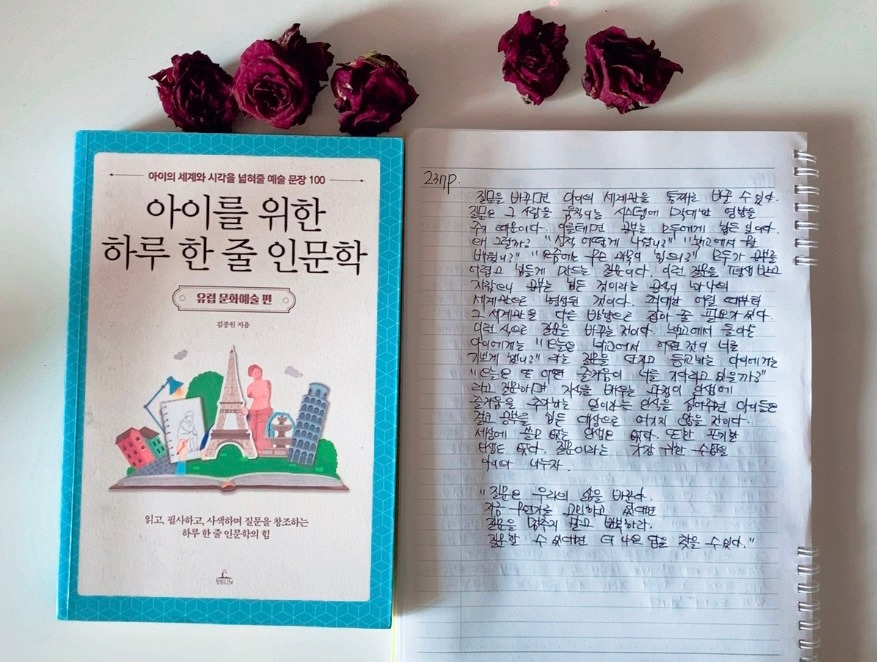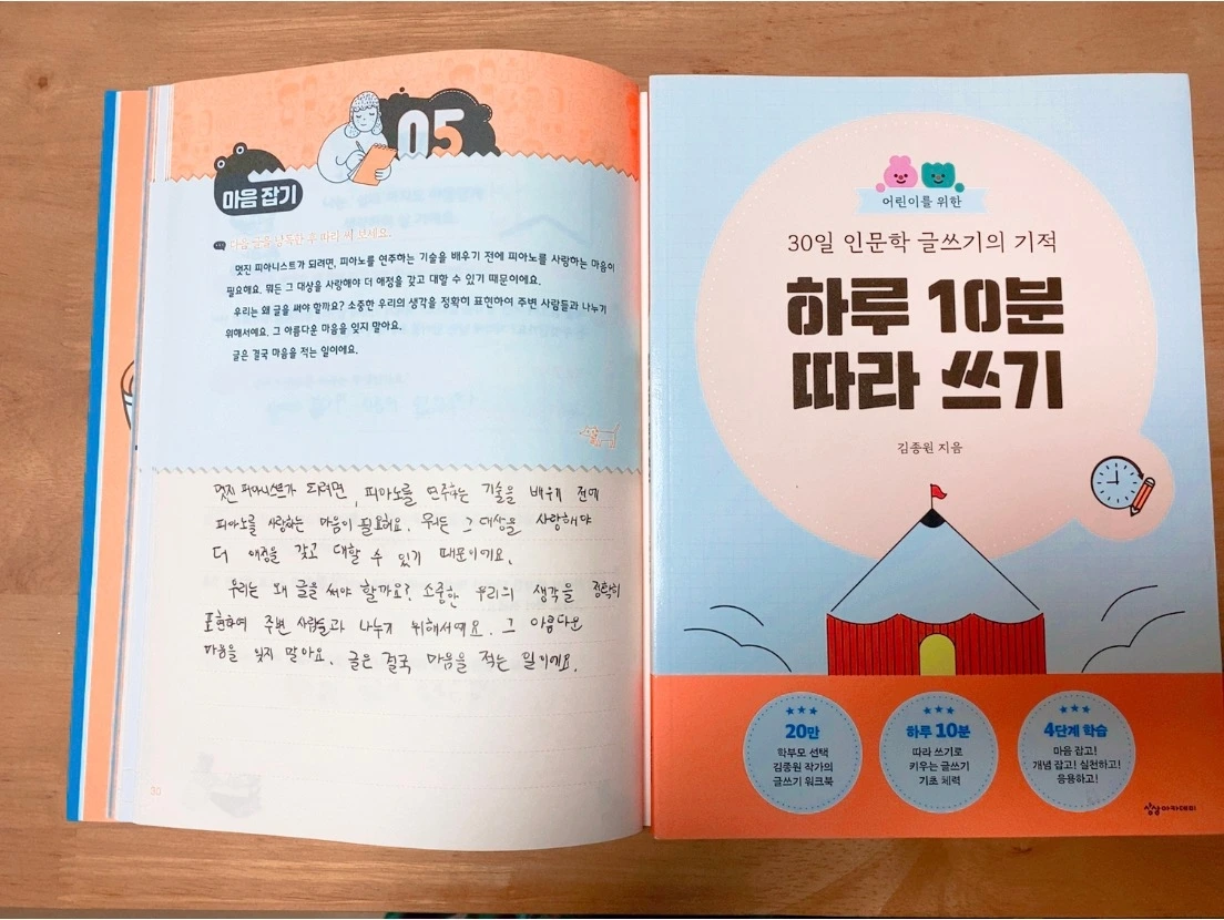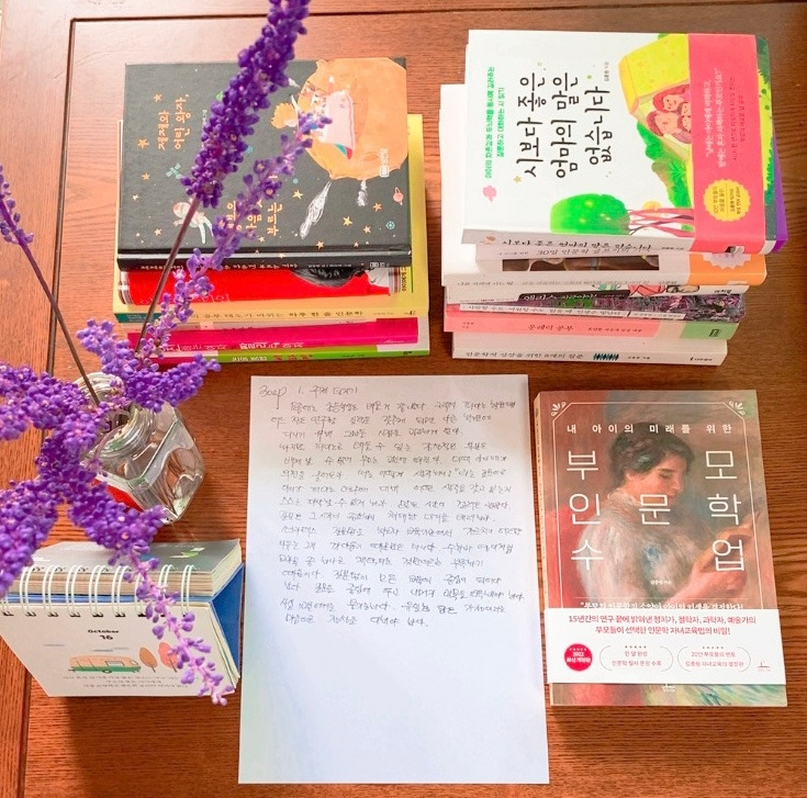 창밖 자동차가 지나는 소리가 마치 비가 내리기 시작하듯 촉촉하게 들려온다. 모두가 잠든 고요한 새벽 습함이 느껴지지 않아도 고슬고슬할 텐데 오늘 둘째는 태권도 수련생들과 캠핑을 가는 날이라서 준비물을 스스로 챙겨두고 오늘과 다음날 필사까지 간직하며 설레는 깊은 밤을 보냈을 것이다. 하루 10분 마음쟙기 코너에서 긴 글을 따라 쓴 아이의 밤길이 그대로 인 것 같아 낭독 후 따라 써 간 문장들이 마치 아이가 쓴 글처럼 느껴지는 건 마음의 글을 써 내려간 것처럼 이 글의 흔적을 읽는 부모의 마음에도 평온과 기쁨 그리고 안정감을 전해주는 아이와 지성이 교합하는 지적 공간에서 이루어지는 가치의 선물이다.