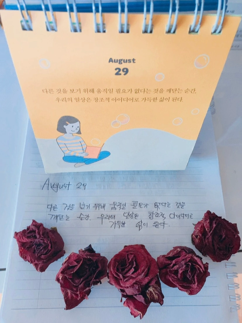 커피도 마찬가지 그 하나를 더 만나볼 생각이다. 커피와 와인을 함께하며 배고픔의 어떠한 거리가 멀어지고 점점 몸과 머리가 순환되는 듯한 가벼움의 존재로 다가갈 수 있는 건 지성과 괴테가 함께한 진실의 순간들이 그 이유를 알고 있을 테니까. 태권도 수업을 가지 못하고 줌으로 가능한 학원 수업으로 대체한 아이는 책가방을 정리하다가 어느새 잠이 들었다. 그렇게 깊은 밤을 보내고 등교할 때는 7시 기상인 아이가 아침식사 준비를 하다가 문득 바라본 7시가 되지 않은 시간에 일어나 필사를 하는 이 모습을 볼 수 있다는 게 부모와 아이가 교감하는 얼마나 근사한 지적 풍경인가