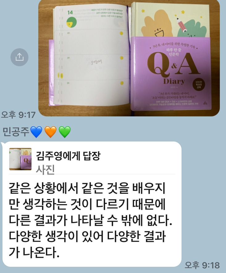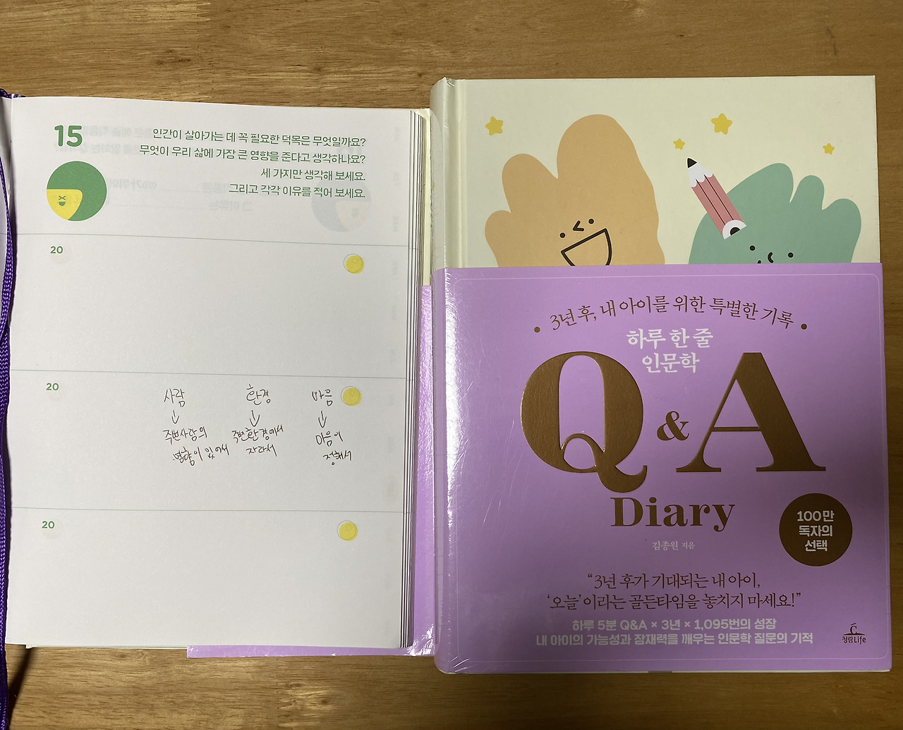 “인간이 살아가는데 꼭 필요한 덕목은 무엇일까요?” 라는 지성이 이끄는 인문학 다이어리 질문에 둘째는 이렇게 예쁜 생각을 적어두었다. 사람, 환경, 마음이라고 화살표를 따라 생각한 이유를 귀엽게 기록했다.그리고 억지로 쥐어짜내지 않고 자신이 하는 올바른 지금이 정답이라고 마음과 생각의 길을 걸은 것이다.