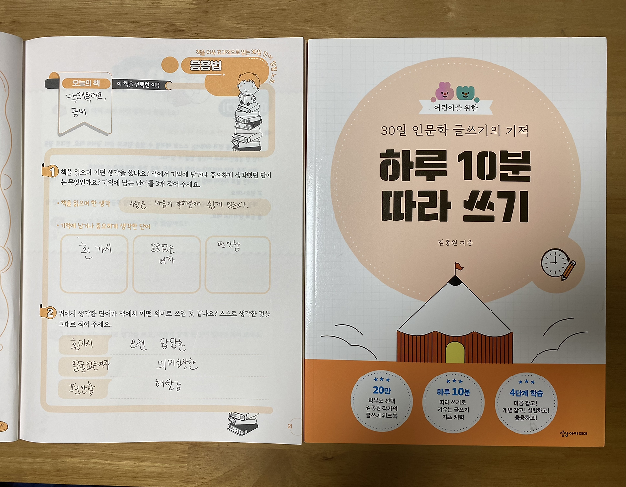 인문학 워크북 시리즈 ‘하루 10분 따라 쓰기’ 의 질문에 아이가 써 내려간 글이 부모로서 참 좋은 마음으로 바라보게 하는 하나의 과정이다. 늘 이런 다양한 사물과 세상과 내면의 생각 공부를 이끄는 지성이 반짝이는 참신한 영감으로 누군가의 생각을 펼치게 하는 근사한 무대이자 장이 되게 하는 데는 분명한 이유가 있으니까.