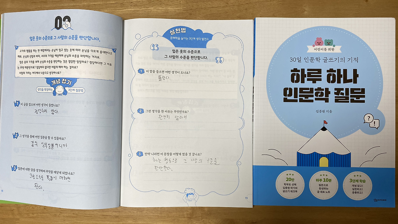둘째는 오늘 자만과 자신감에 대해 글길을 따라가고 입은 옷이 아니라 그 사람이 하는 행동에 따라 상대의 수준을 판단한다는 인문학 질문 워크북에서 자신의 생각을 글로 정의해 갈 줄 안다.