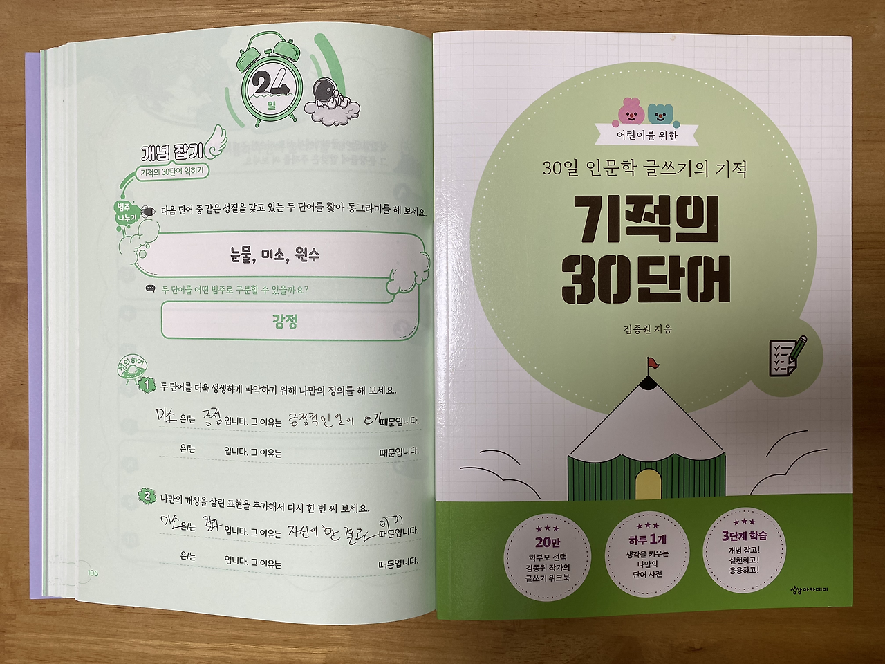 둘째의 필사 글이 현실적이며 자신의 어떤 생각에서 이 글을 이어갔을지 궁금해진다. 질투하고 시기한다는 것의 표현이 실감 나는 듯 이런 경험이 있었는지 한 번쯤 아이의 말이 듣고 싶어지는 대목이다. 솔직하게 자신을 받아들이고 성장할 수 있는 믿음직한 아이가 좋다라고 쓴 ‘인문학 다이어리’ 의 질문에 대한 아이의 생각과 인문학 워크북 시리즈 ‘기적의 30 단어’ 에서 눈물, 미소, 원수의 단어 중 미소를 선택한 아이의 긍정으로 가는 시선이 이 아침 한 페이지로 연결되는 엄마의 기분에도 맑음과 희망의 미소가 차오른다.