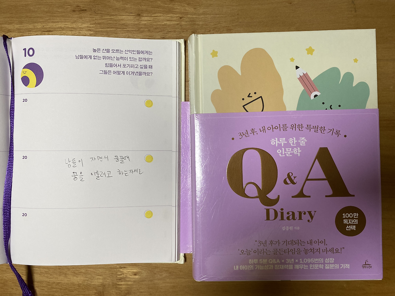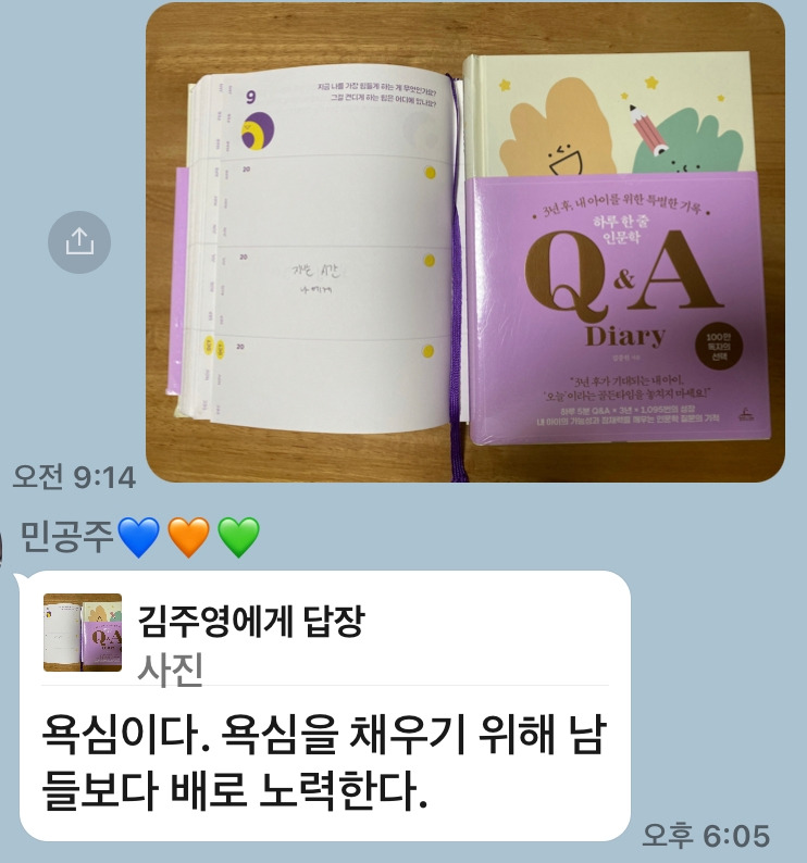 오늘도 아이는 가방을 메고 학원을 향한다. 나는 따뜻한 식사를 준비해 아이에게 아침을 주는 일이 아이를 생각하는 따스한 엄마의 손길이자 내가 보내고 싶은 마음이다. 하루 한 줄 인문학 Q&A 다이어리의 질문과 아이의 생각을 보며 또 한 번의 뭉클한 소용돌이가 지나간다. 질문이 좋으니 물론 생각이 향하는 가치를 기대할 수 있다. 높은 산을 오르는 산악인들에게 남들이 잠든 사이 꿈을 꿀 때 꿈을 이루기 위해 힘들어도 포기하지 않은 어떠한 자신의 노력과 열정의 길을 발견하는 아이의 확언이 참 근사한 아침 생각하는 한 줄 빛이 되어 나를 자극하는 일침이다.