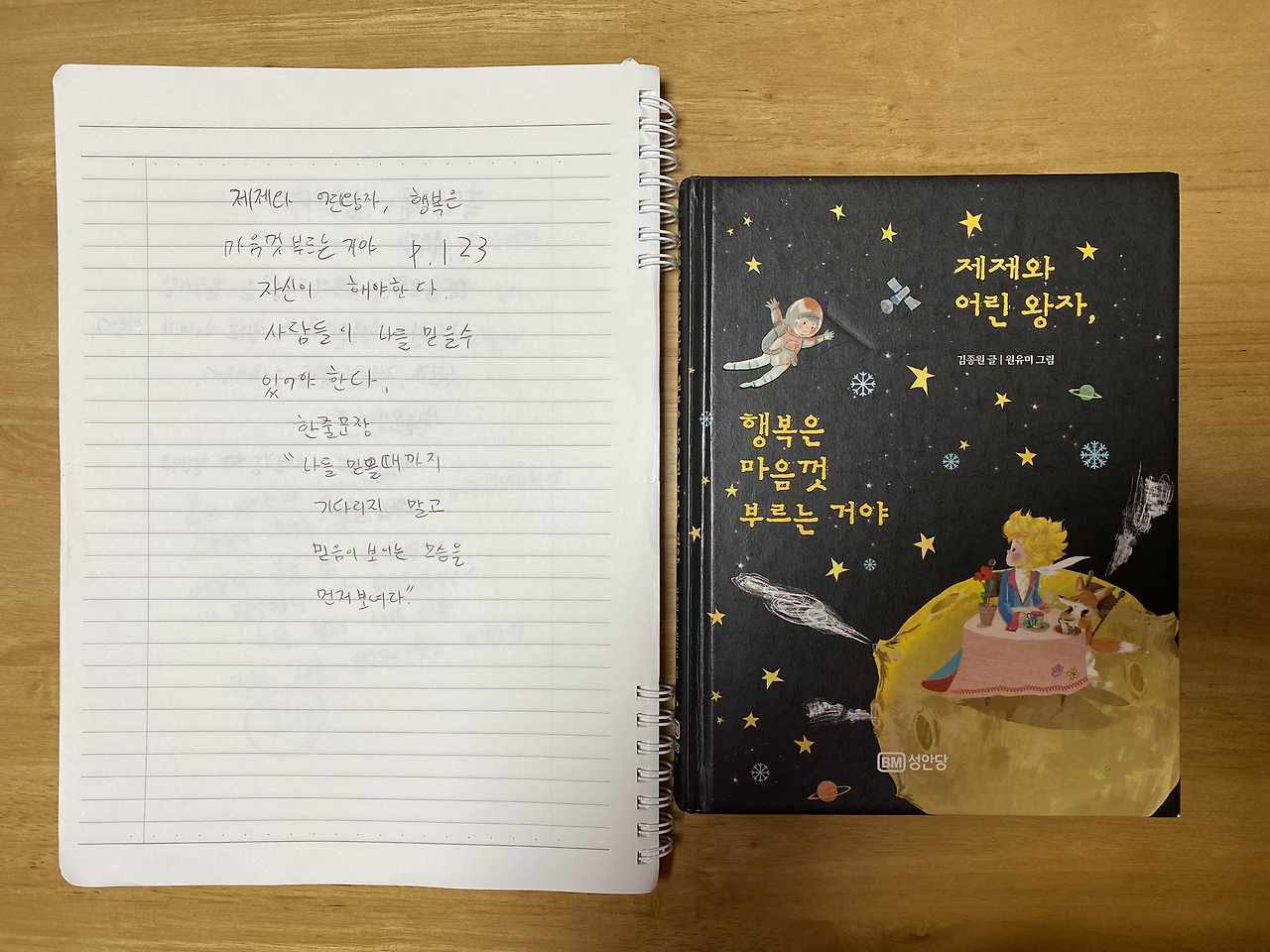 앞을 줄인 책 제목인 ‘제제와 어린 왕자 행복은 마음껏 부르는 거야’ 를 읽고 싶다는 아이의 말이니까.아이의 몇 걸음을 멈추고 엄마가 아이의 방꺼지 배달해주자 아이는 침대에 앉아 오늘의 발걸음에 잠시 휴식을 보낸다. 아이의 필사 글에는 언제나 생각하게 만드는 힘이 쓰인것 같아 자꾸 보게 된다.