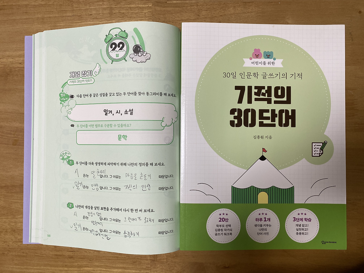 ‘기적의 30 단어 워크북’ 에서 이 책을 집필하신 작가님이 이끄는 질문을 보고 일기와 시를 정의한 아이의 생각 길이 참 예쁘다.주말 컨디션이 좋지 않다가 조금씩 휴식을 취하는 둘째가 쓴 글을 보다가 다시 밤길을 걸어가면 내일이 다가오겠지 보건실에서 손과 팔에 해준 붕대를 풀고 손바닥에 패인 걸 보여주는데 별거 아니라고 했었는데 별거라서 보건 선생님께서 이렇게 처치해 주신 거구나.누군가 가리는 건 온전한 내가 될 수 없는 것처럼 나는 언제나 하나로 볼 때가 가장 좋은 영감을 많이 볼 수 있어 이런 내가 나라서 내 마음을 따라가는 마음이 그러하다.