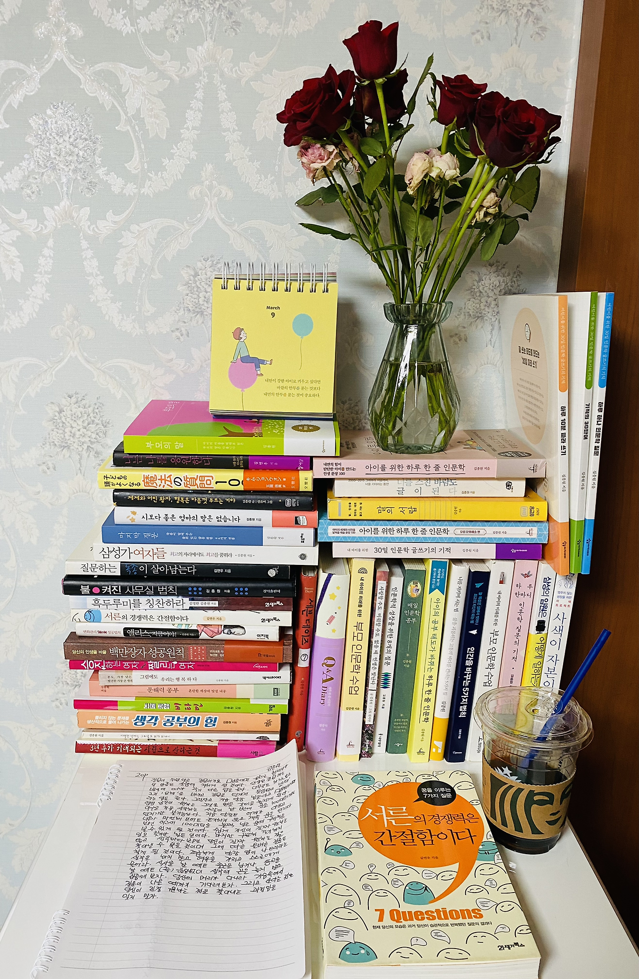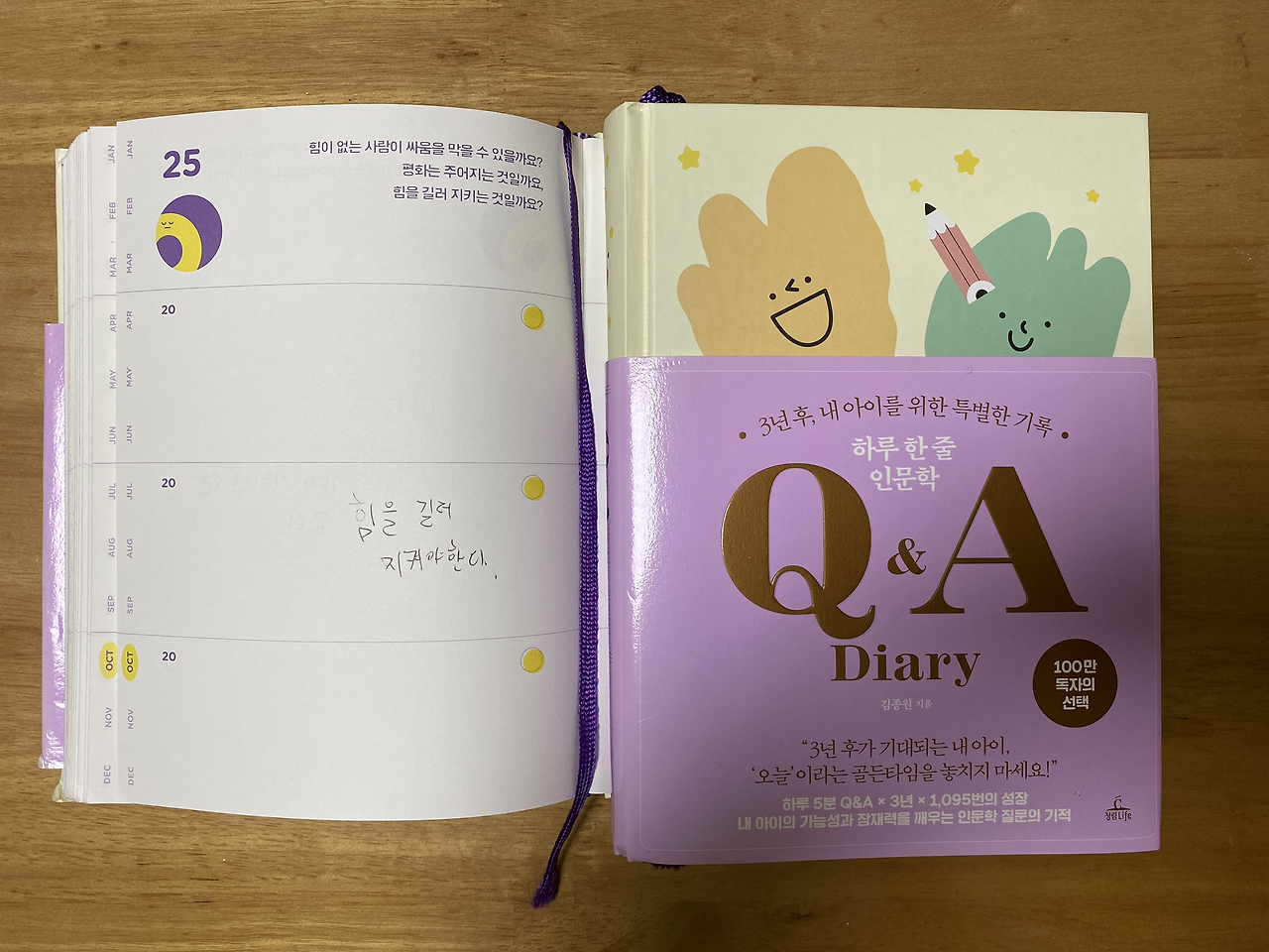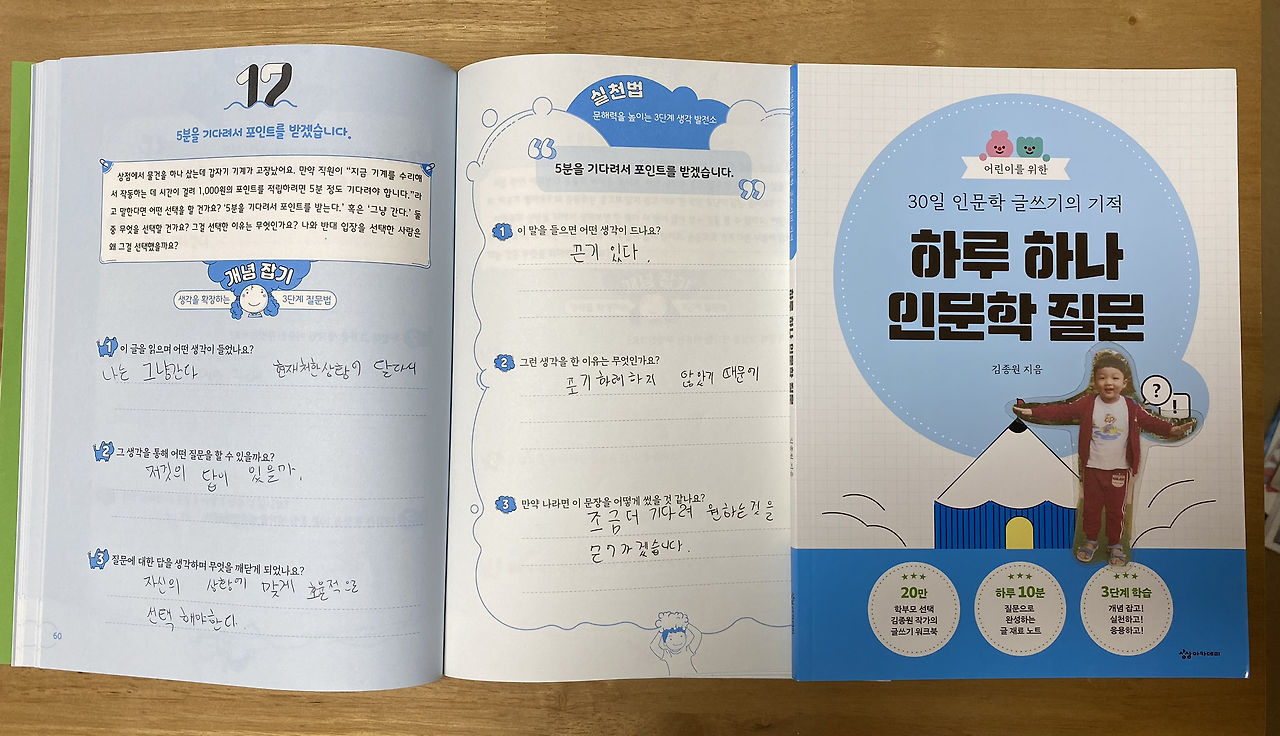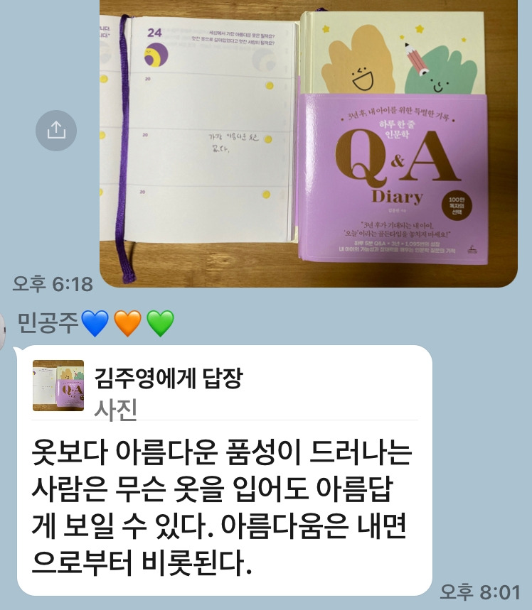 ‘하루 한 줄 인문학 Q&A 다이어리’를 필사하며 멋진 사람이 된다는 건 입는 옷이 아닌 아름다운 내면의 크기다 라는 멋진 말이 큰아이의 생각이다. 큰 아이와 둘째가 보내는 하루가 쌀쌀한 오후나 늦은 밤 집으로 귀가하며 들어오는 아이들이 바깥세상에서 행복하게 살다온 바로 오늘이다. 이 세상 어른과 아이의 하루가 그런 것처럼 이른 아침 일어나 잠시 쉬던 자신을 깨워 몸을 일으켜 세우고 세상이라는 무대에서 자신이 되어 사는 오늘의 일이라서 그 무엇보다 수준 높은 생각의 질과 깊이를 질문하며 산다는 것이 중요할 것이다.