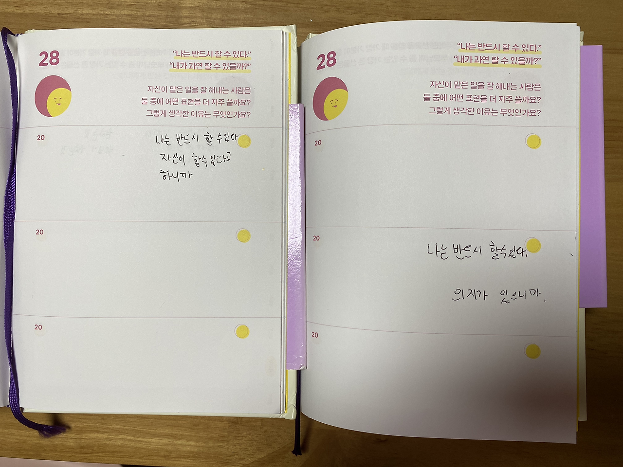 ‘하루 한 줄 인문학 질문 다이어리’ 북을 보고 쓴 1년 전의 둘째가 쓴 일기 글이 거의 흡사하다. 나는 할 수 있다. 자신감과 의지를 발견한 아이의 생각이 변함없이 잘 자라고 있다는 사실을 알게 되니까. 중2 아이의 다이어리 북이 점점 손의 온기가 합해지며 닳아가는 건 아이가 보낸 지난 시간이 이 안에서 함께 지내고 있는 삶의 흔적이며 증거다.