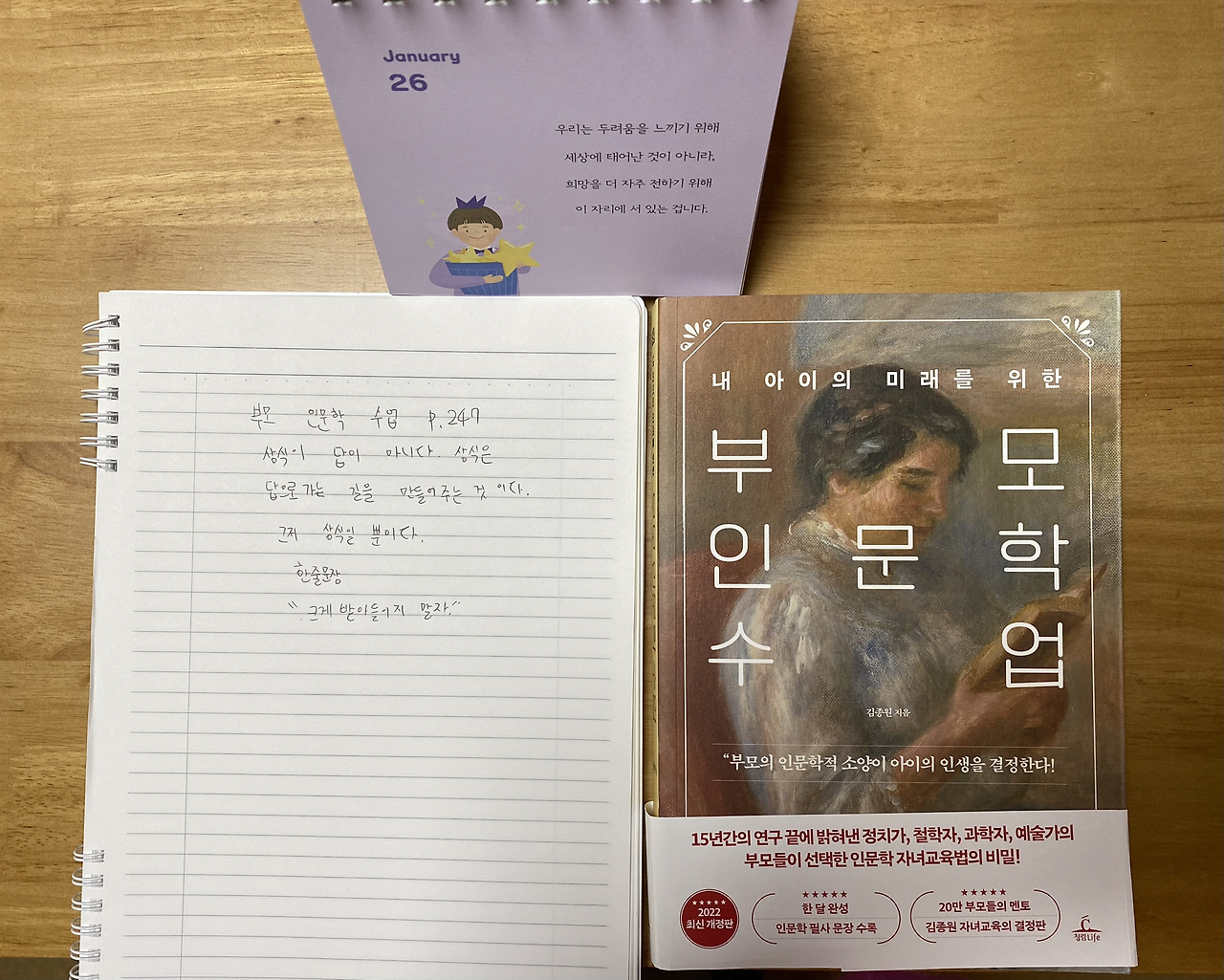 아이는 상식에 관해 생각했다. 답으로 가는 길을 만들어 주는 것이지 답을 찾아과는 과정이 담긴 지혜는 아니라는 사실을 생각한 것과 같다. 아이가 매일 밤 독서하고 필사 낭독 그리고 글쓰기로 연결하며 아이만의 느낌을 찾는다. 그 모습과 순간이 어쩌면 아이만의 단어를 찾아가는 과정의 연속인 갓이다.