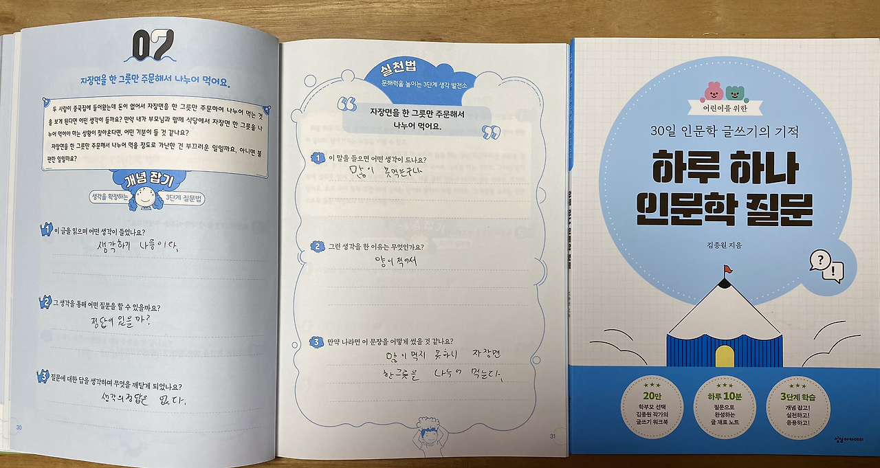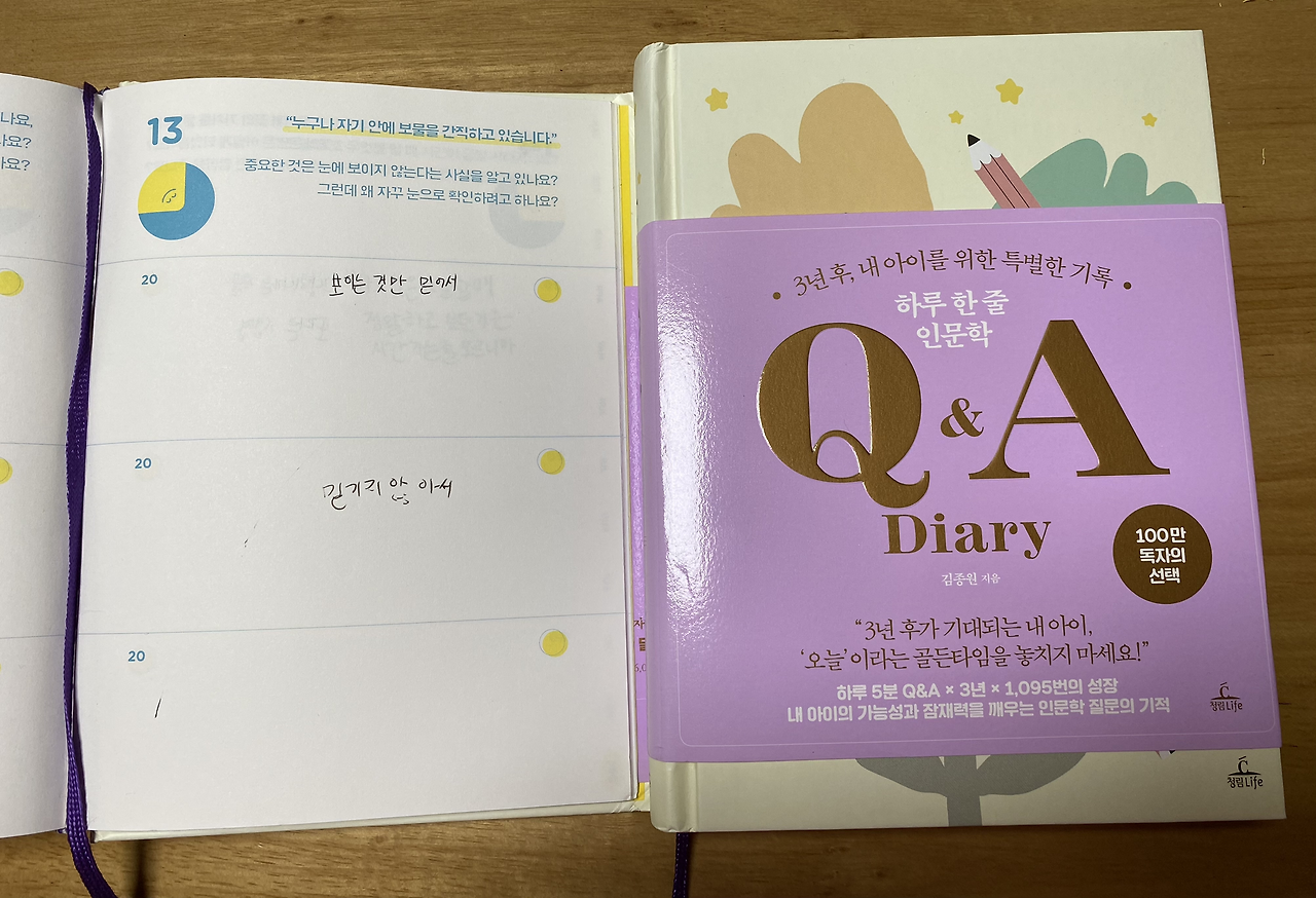 인간에게 바다는 많은 부분으로 침투해 아름답게 차지한다. 땀과 노력의 방울이 바다처럼 모이는 풍경이 결국에는 성공을 의미하는 본질이라는 것을 둘째는 찾게 된 거니까. 인문학 워크북인 ‘하루 하나 인문학 질문’ 의 글을 보며 아이의 생각을 그대로 느낄 수 있다. 펼쳐진 책 2 페이지 중 한 페이지는 예전에 쓴 글이고 또 한쪽의 질문을 보고 오늘 필사글을 쓴 걸 보자면 아이의 시선은 어쩌면 처한 한 사람의 기분을 그리 마음이 약하지 않게 해주는 깊이가 있다.