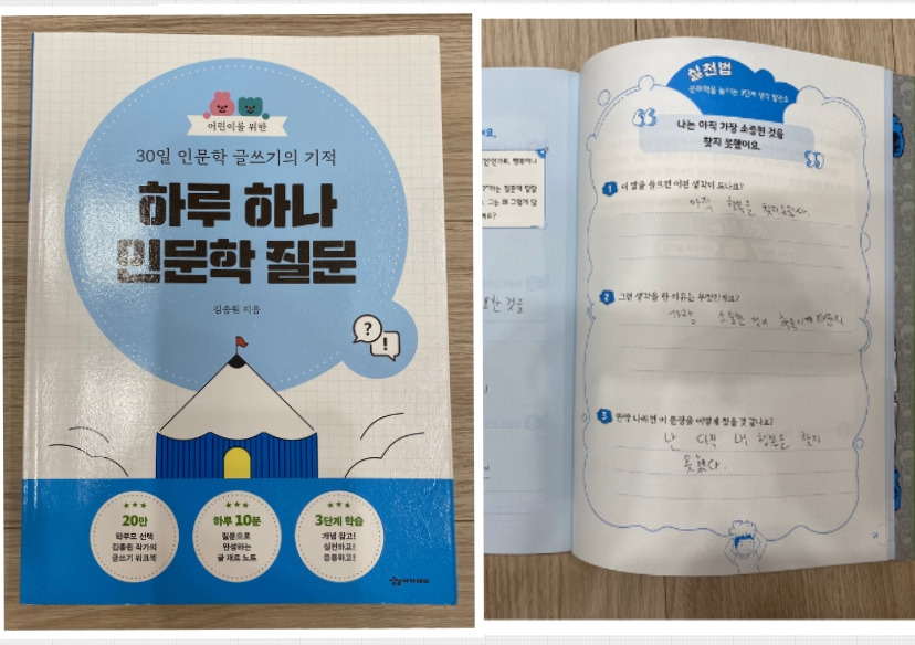 둘째의 필사 글을 보다 보면 생각이 늘 하나로 통하고 있음을 알게 된다. 오늘 아이가 본 인문학 워크북인 ‘하루 하나 인문학 질문’ 을 보는데 이 질문에 답한 아이의 글이 왠지 슬퍼 보여 글을 읽으며 따라가 본다. 내게 가장 소중한 것이 아이에게도 같은 행복이라는 것이 그리운 거구나. 진정한 행복으로 가는 나의 길이 과연 어디일까. 아이는 이처럼 매일 자신의 길을 꾸준한 걸음으로 스스로 떠나간다.