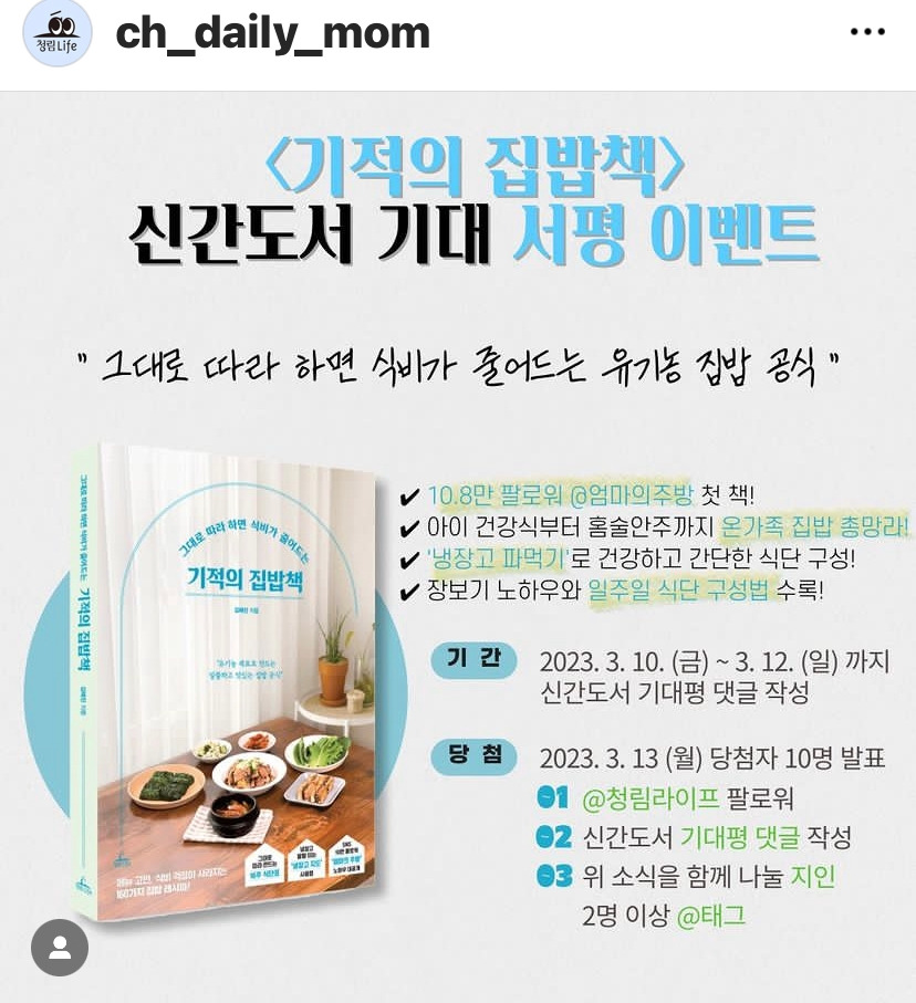아래 청림라이프 맘 인스타 그램 계정에서 신청 댓글 남기시고 좋은 책과 꼭 만나보세요.~