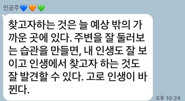 고2. 아이는 자유롭게 할 수 있도록 카톡 필사가 좋은 것 같습니다. 늘 한 번 잡으면 잘 써야 한다는 생각이 주도하기에 편하게 하면 된다고 해도 한 번 내어 놓은 자신의 작품이라고 생각하는지 오래 걸리고 마음을 많이 쓰기에 이렇게 실천하는데 자유를 주는 게 좋습니다.