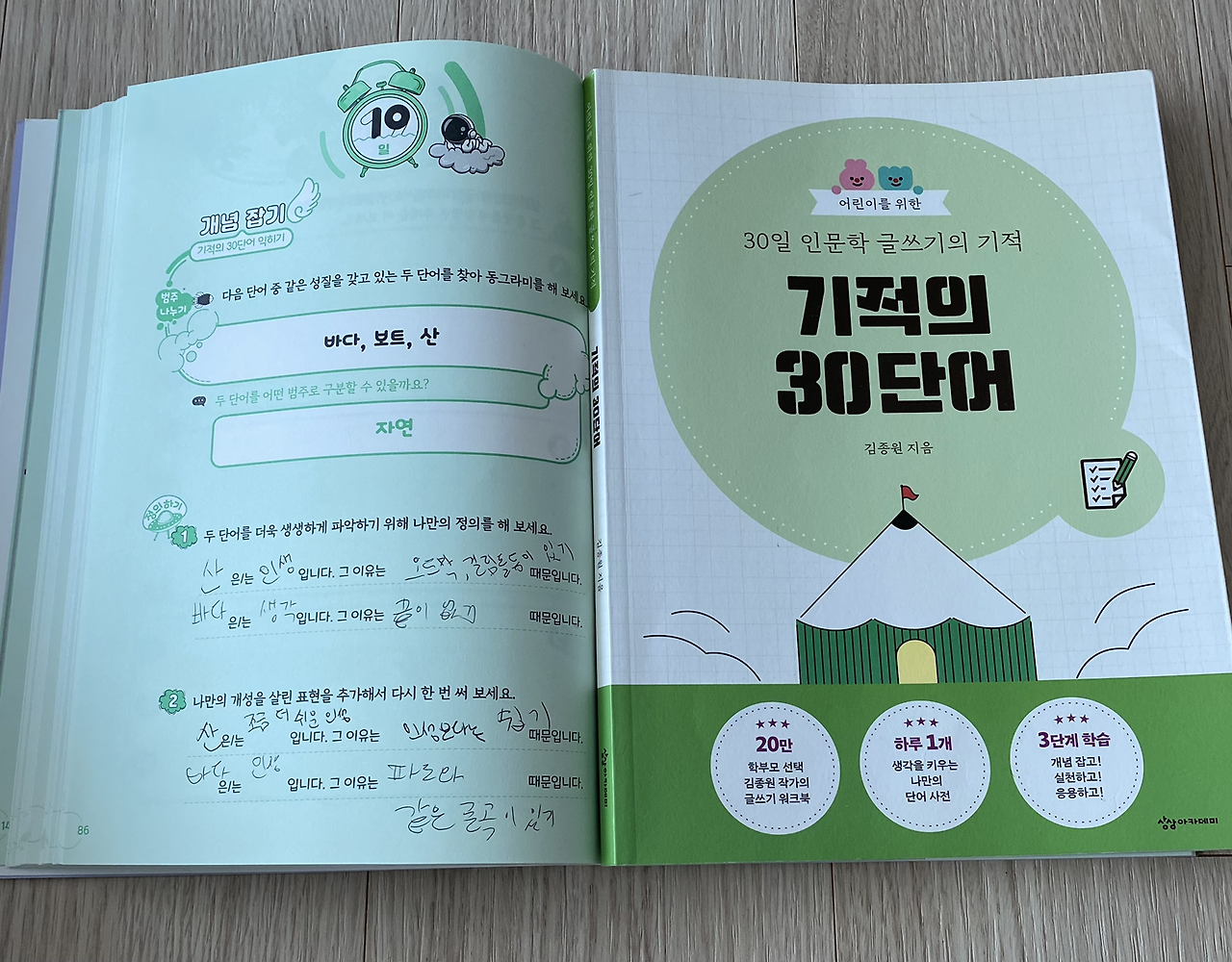 중3 아이가 매일 읽고 필사하는 워크북 중에서 ‘기적의 30 단어’의 질문에서 찾은 바다와 보트 그리고 산 을 자연의 범주로 정하고 아이는 산 과 바다로 문장을 스스로 연결해 보았다.