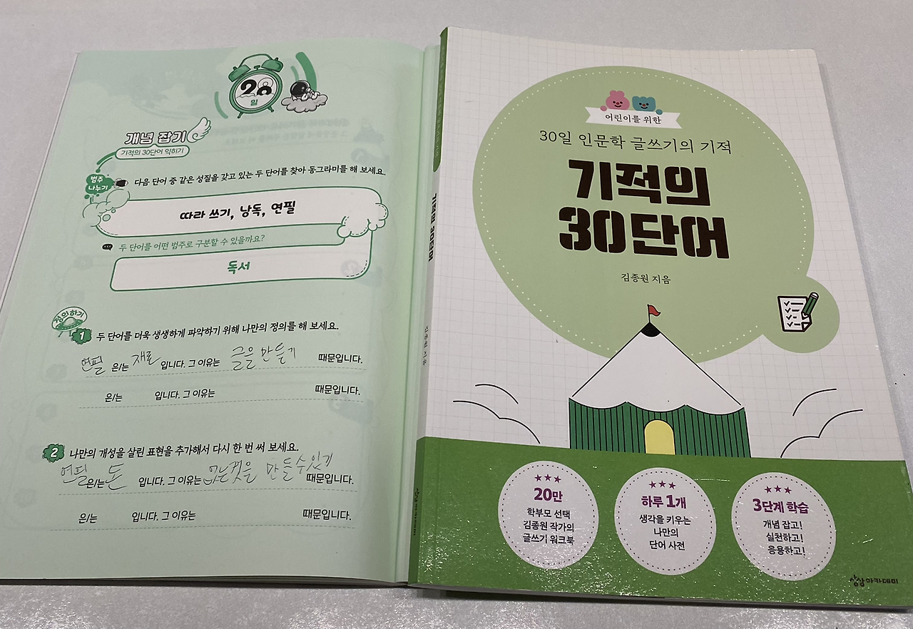 인문학 워크북 ‘시리즈 기적의 30 단어’의 질문인 따라 쓰기, 낭독, 연필 중 아이는 연필을 잡았고 연필은 재료이며 글을 만들기 때문이라며 연필은 없는 것을 만드는 무엇이든 상상할 수 있어 그릴 수 있는 돈과 같다고 아이는 정리했다.
