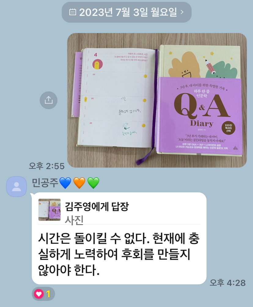 그래. 그 말도 맞다. 지나간 시간과 현재 미래를 바라보는 시선의 다른 차이가 있는 거니까. 그렇게 생각하는 것이 잘못된 게 아니라 다양한 시선에서 발견한 대화를 나누며 아이는 질문을 보고 자신의 생각을 정리해 본다.