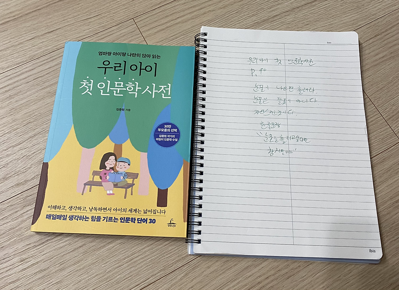 중3 둘째 아들이 매일 인문학의 대가 김종원 작가님 저서 를 읽고 필사하는 인문학 워크북 세트 중 ‘우리 아이 첫 인문학 사전’ 글을 보고 쓰는 아이가 발견해 놓은 눈물이라글은 물론 다른 아이의 생각들이 어쩌면 모두가 아이와 어른을 경계하지 않은 누구나의 삶에서 나오는 생각과 생활속의 이야기이며 주제의 질문이라서 고요한 글이 향하는 이 글을 써주신 작가님의 마음과 눈물이 담긴 글을 보며 읽고 무엇을 어떻게 멈추어 사고하며 창조하느냐 그리고 나에게로 가져와 실천하느냐가 중요한 깨달음의 깊이로 다가온다.
