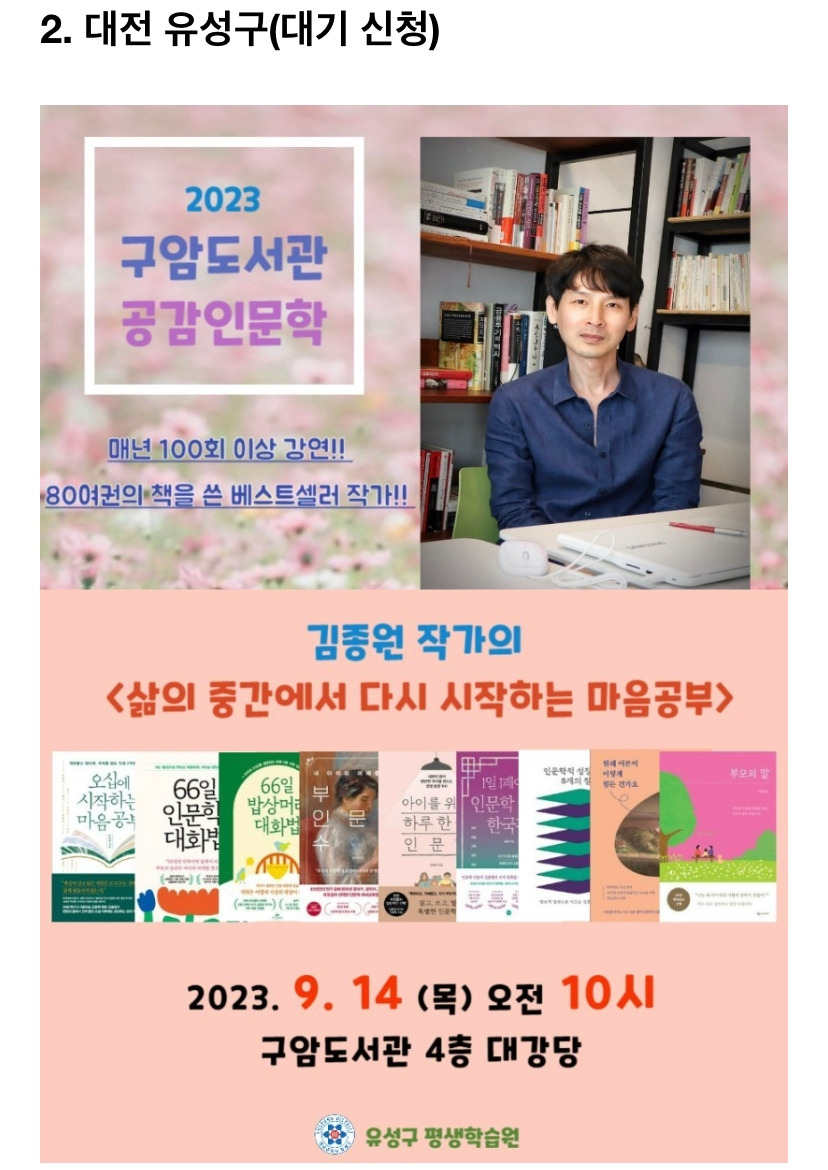 2. 대전 유성구 구암도서관 인문학 강연 (대기 신청)