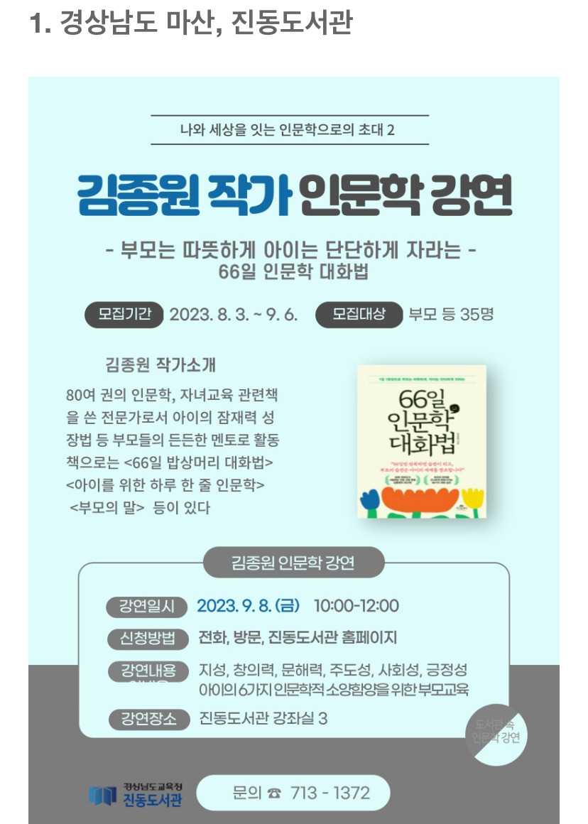 김종원 작가님 인문학 강연 문의 및 접수는 각 도서관 접속 홈페이지에서 가능하오며 자세한 추가 강의를 작가님의 공간에서 확인하시어 귀한 소식 나누시길 도움 되시길 소망합니다.~