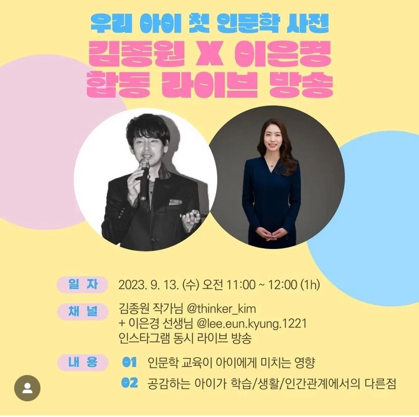 9월 13일 오전 11시부터 부모 자녀 교육의 전문가 김종원 작가님과 이은경 선생님의 합동 인문학 강의를 함께 하세요.~