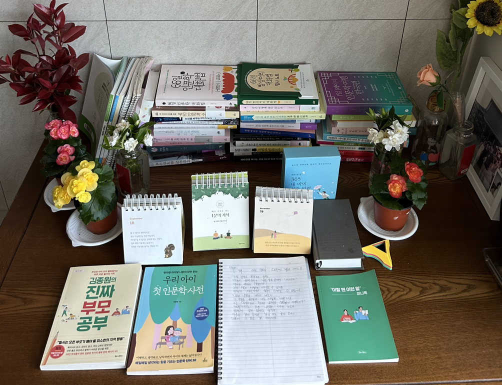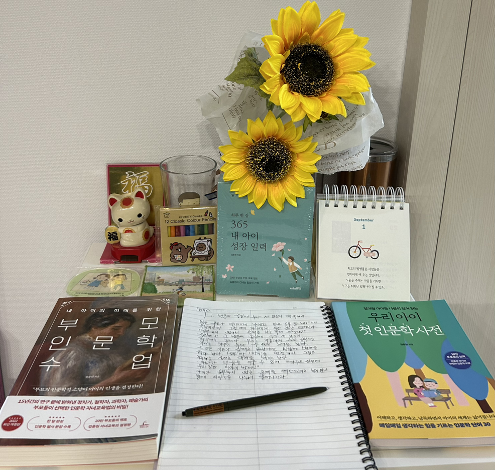 큰 아이가 초등학교를 다닐 때 일기 쓰기를 하며 글쓰기를 도울 수 있었다. 어디서 배운 적 없으나 글쓰기 즉, 글씨체와 일기를 쓰는 글쓰기는 어릴 때부터 습관이 되어야 한다는 믿음이 있었기 때문이다. 그래서 큰 아이 일기를 늘 내가 확인한 후 학교 선생님께 검사를 받게 되었고 각종 글짓기 행사 때는 수상하는 영광을 안을 수 있었다. 둘째아이때도 그와 같았지만 다른 게 있다면 독서의 양이다. 큰아이가 중학생이 되기 전에는 매일 꾸준히 다독을 했고 둘째 아이는 매일 다독이 아닌 매일 하루 한 장씩 멈추는 독서와 함께 낭송을 병행하고 있다.
